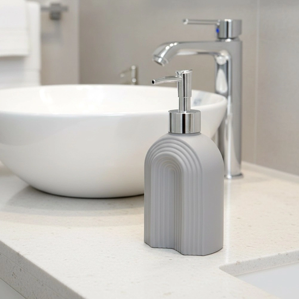 Praktičan i estetski pomoćnik za svakodnevnu higijenu i čišćenje. Stakleno tijelo u sivoj boji s nježno rebrastom teksturom prostoru daje moderan štih i pomaže održati red na umivaoniku ili kuhinjskoj radnoj plohi. Kromirana pumpica osigurava glatko i kontrolirano doziranje.