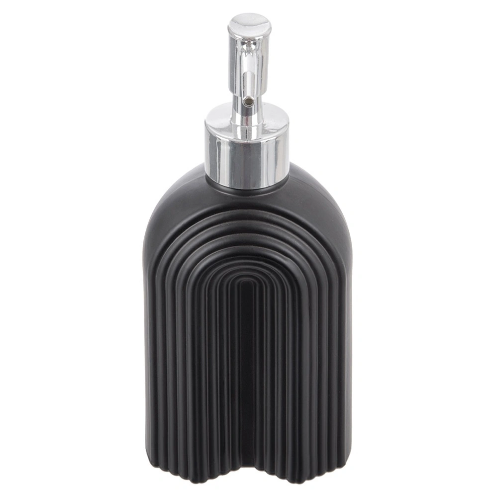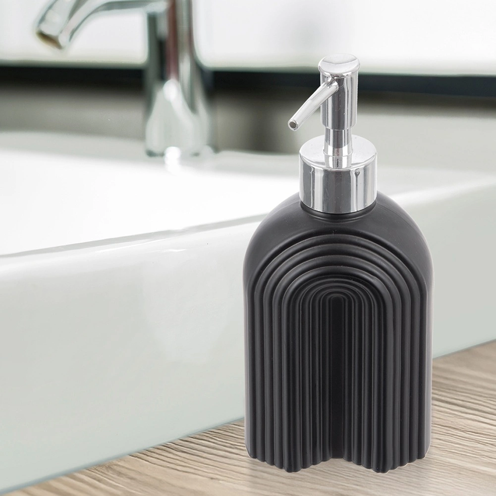 Stilski dozator od kvalitetnog stakla u mat crnoj boji nudi bezvremenski izgled i praktičnu primjenu u svakodnevnoj brizi o kućanstvu. Rebrasto zakrivljeno oblikovanje bočice osigurava čvrst hvat i djeluje kao dekorativni element, dok metalik sjajna pumpa dozira sapun ili kremu precizno i bez rasipanja.