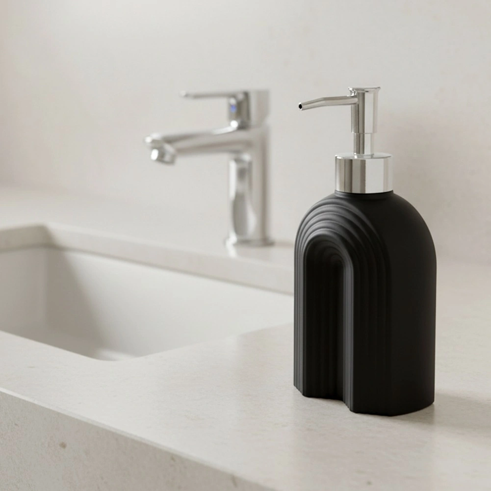 Rebrasto stakleno tijelo u elegantnoj crnoj boji sa sjajnom pumpicom daje kupaonici i kuhinji premium izgled te poboljšava prianjanje pri korištenju.