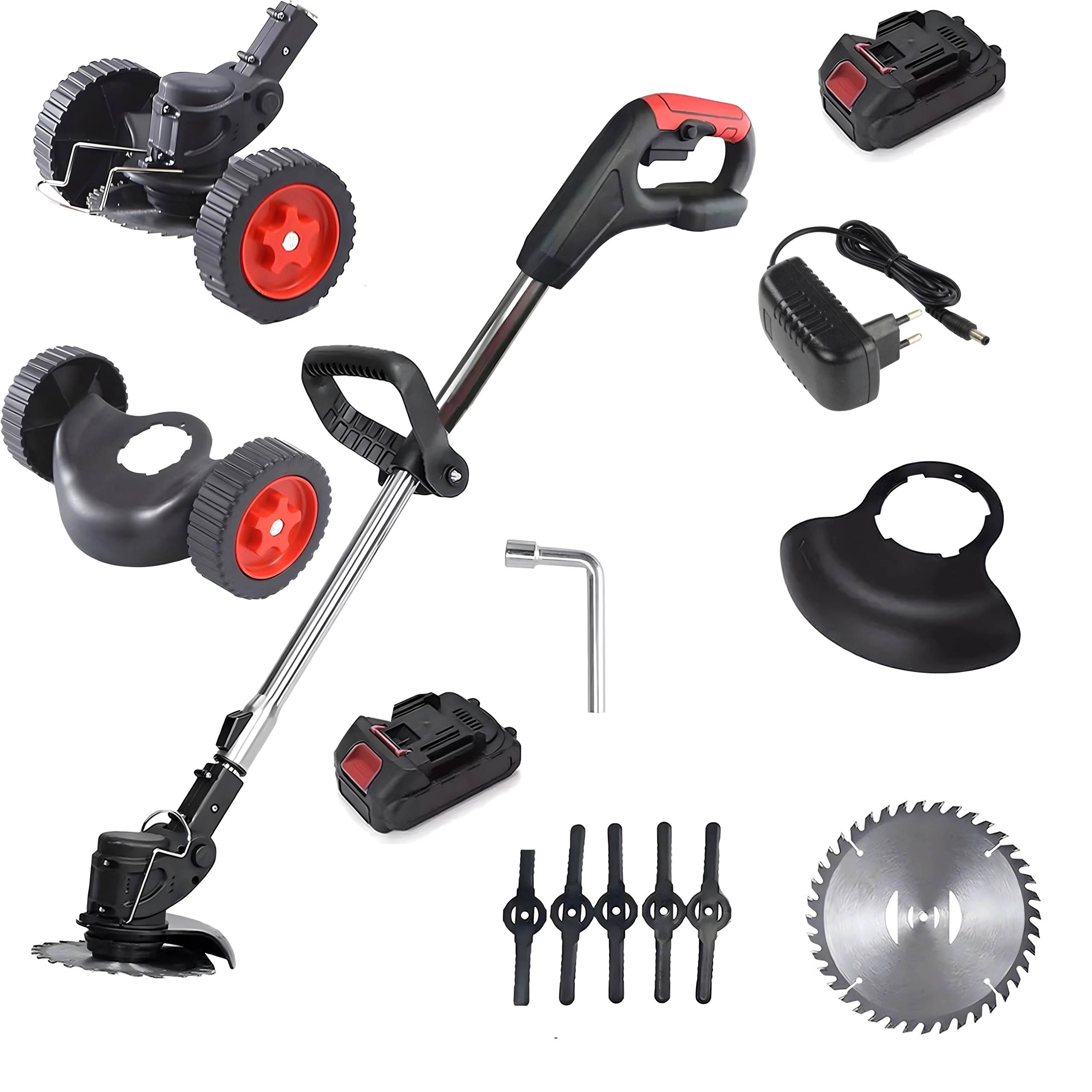 Stroj, zamjenjive oštrice/noževi, vodilni kotači, opcionalno baterija i punjač ovisno o setu