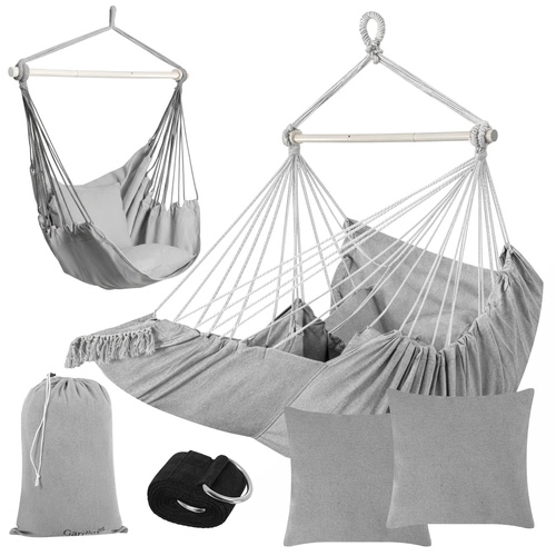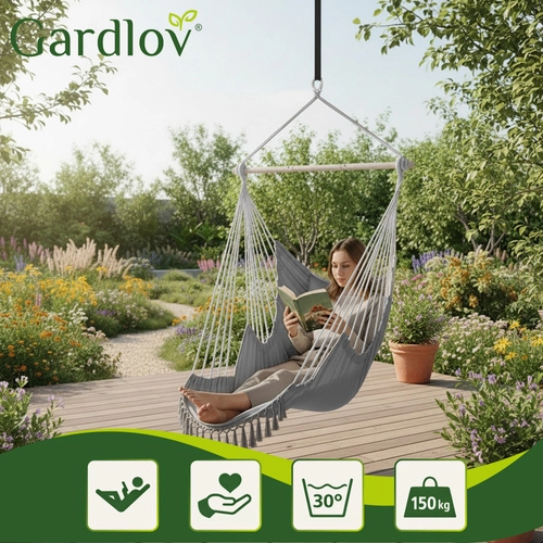 Uživajte u mirnom opuštanju kod kuće i na otvorenom sa stilskom visećom ljuljačkom foteljom GARDLOV. Izdržljiva tkanina, stabilizacijska prečka i nosivost 150 kg osiguravaju sigurno i udobno ljuljanje. U pakiranju se nalaze 2 mekana jastuka, viseća traka i praktična torba za lako prenošenje. Idealno za balkon, terasu, vrt i dnevni boravak.