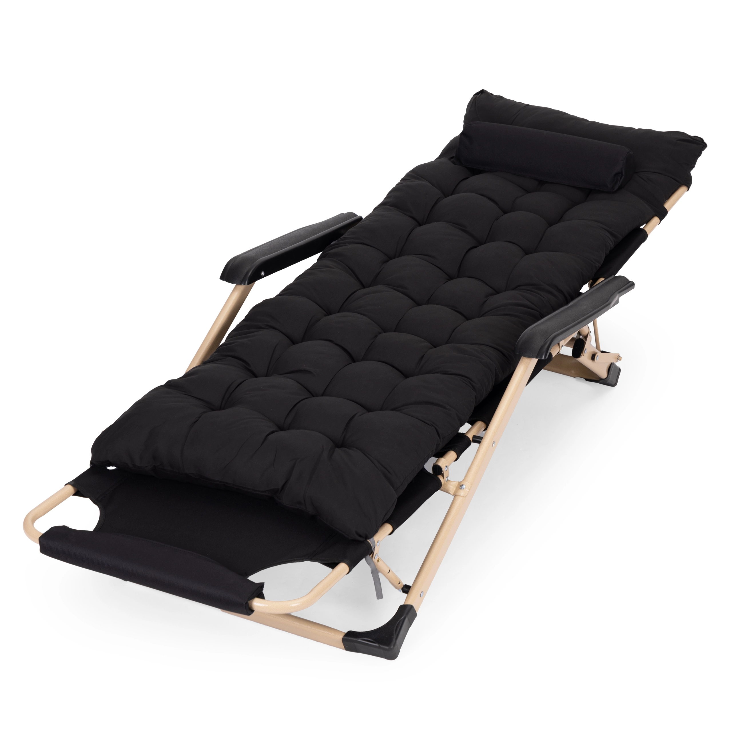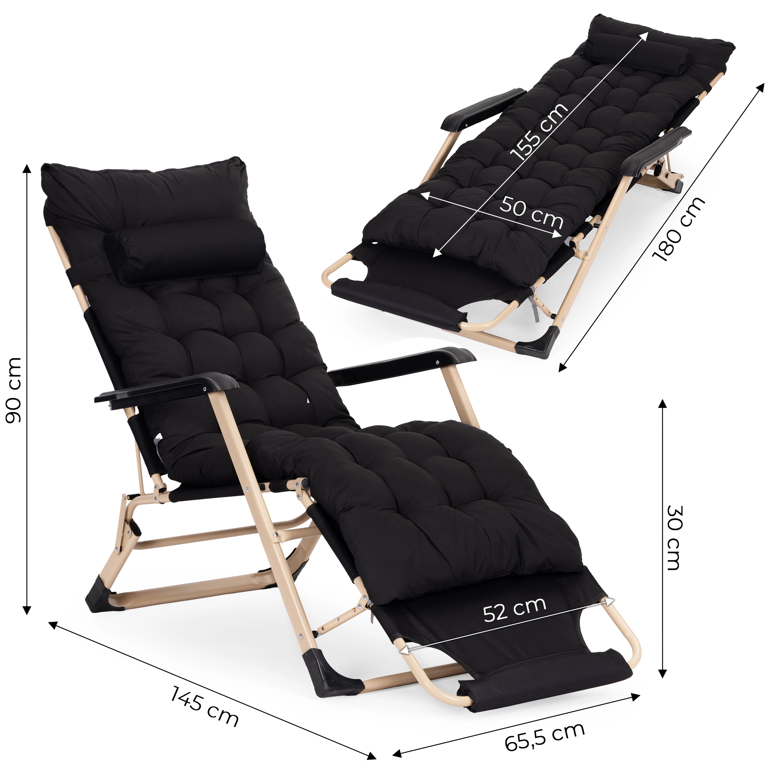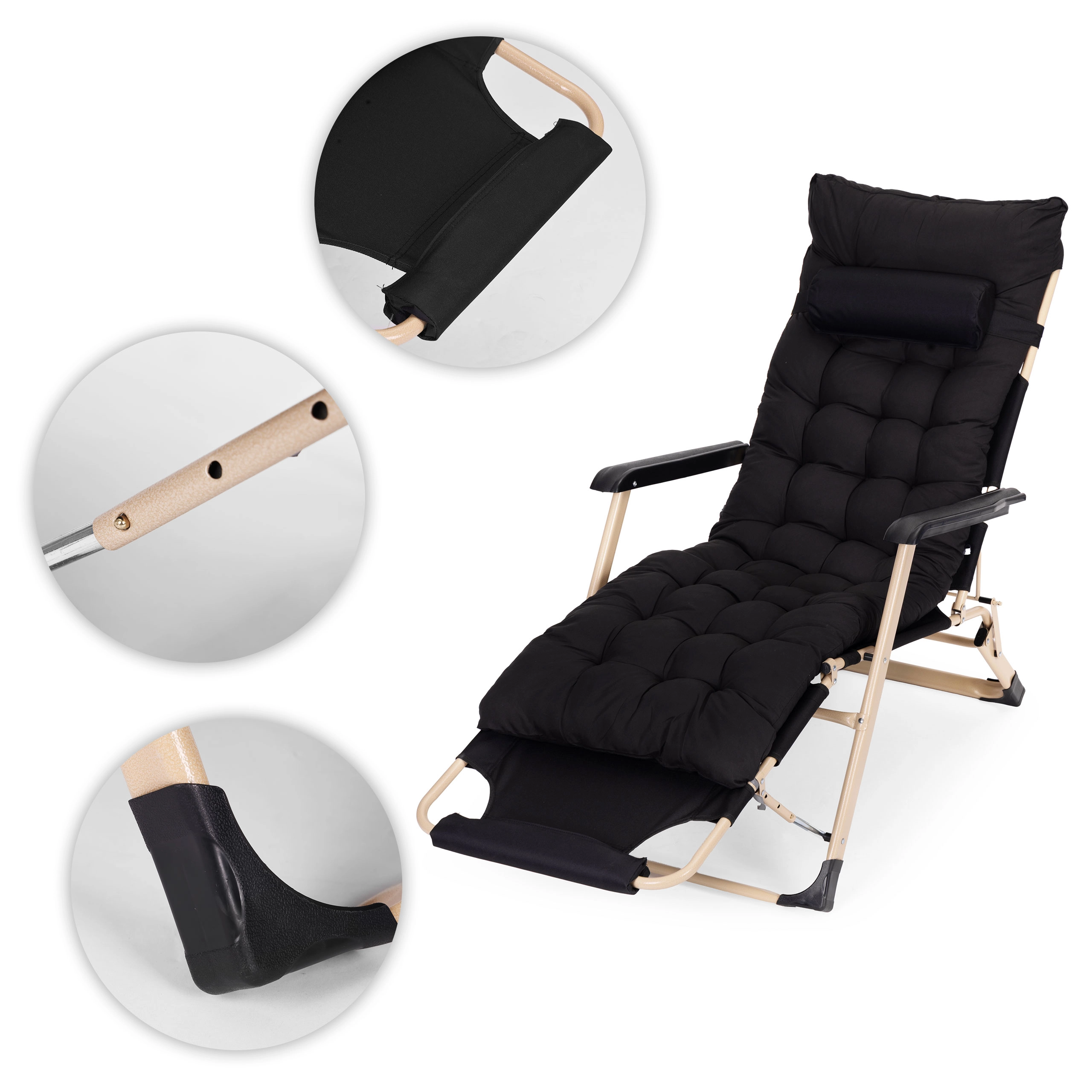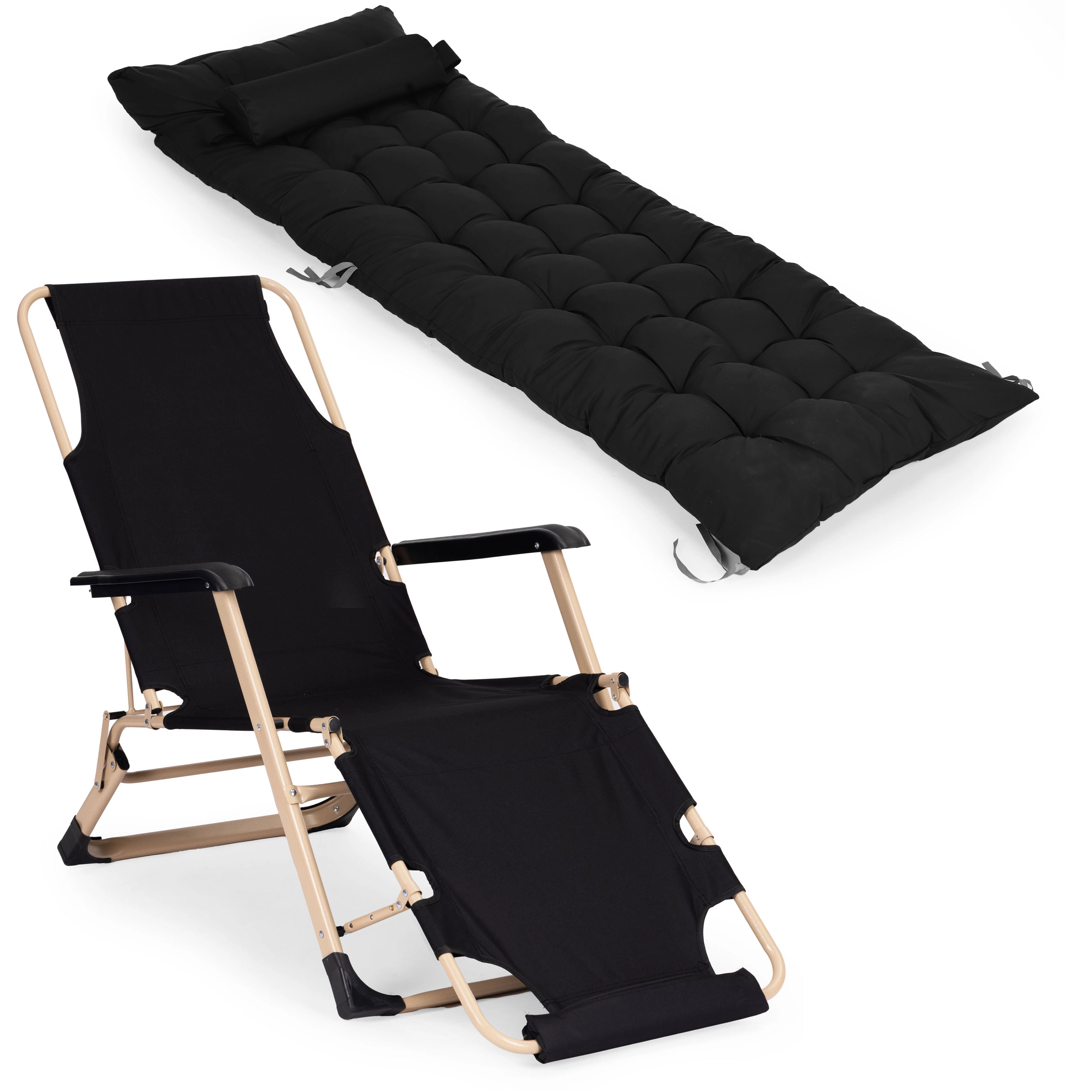 Uživajte u udobnosti bilo gdje u vrtu, na terasi ili na plaži zahvaljujući ovom univerzalnom 2-u-1 ležaljku/fotelji. Nudi čvrst čelični okvir s praškastim premazom, mekani prošiveni jastuk s naslonom za glavu i oslonac za noge s 3 razine podešavanja. Stabilnost osiguravaju protuklizne završne kapice, izdržljivi materijali su otporni na vlagu, a cijela ležaljka ima sklopivu konstrukciju za lako prenošenje i spremanje. Nosivost do 150 kg.