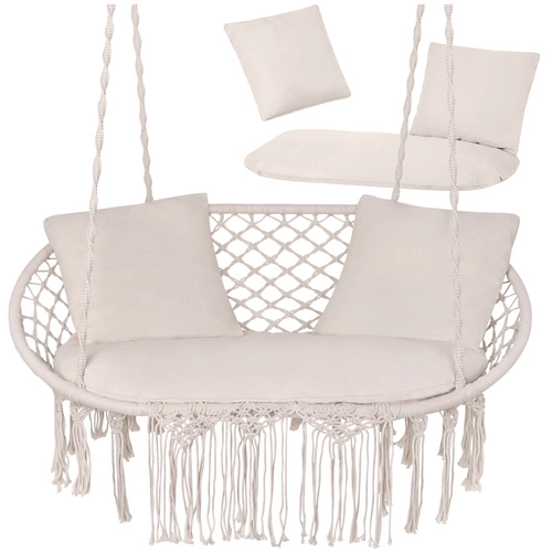 Pretvorite svoju viseću fotelju u pravu oazu opuštanja. Dvodijelni sjedni dio i dva kvadratna jastučića ispunjavaju prostor za sjedenje te osiguravaju stabilnost i meku udobnost pri odmoru u dvoje. Univerzalan dizajn i izdržljivi materijali prikladni su za vrt, terasu, balkon i interijer.