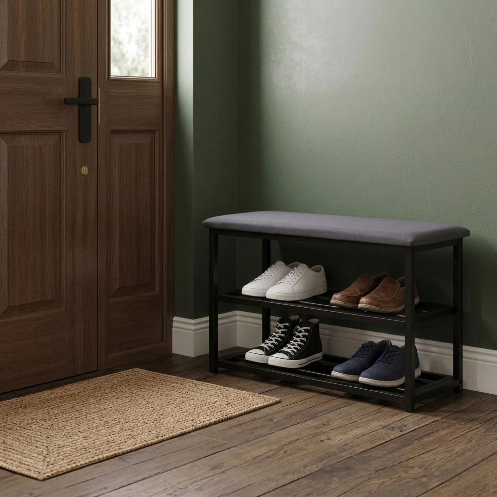 Sjedalo se sastoji od MDF ploče, sloja pjene i presvlake od baršunaste tkanine ukupne debljine oko 3 cm – ugodno na dodir, elegantno na pogled i udobno pri obuvanju i izuvanju. Otvoren dizajn polica omogućuje brz pristup i bolju cirkulaciju zraka, pa obuća lakše presušuje i ostaje svježa.