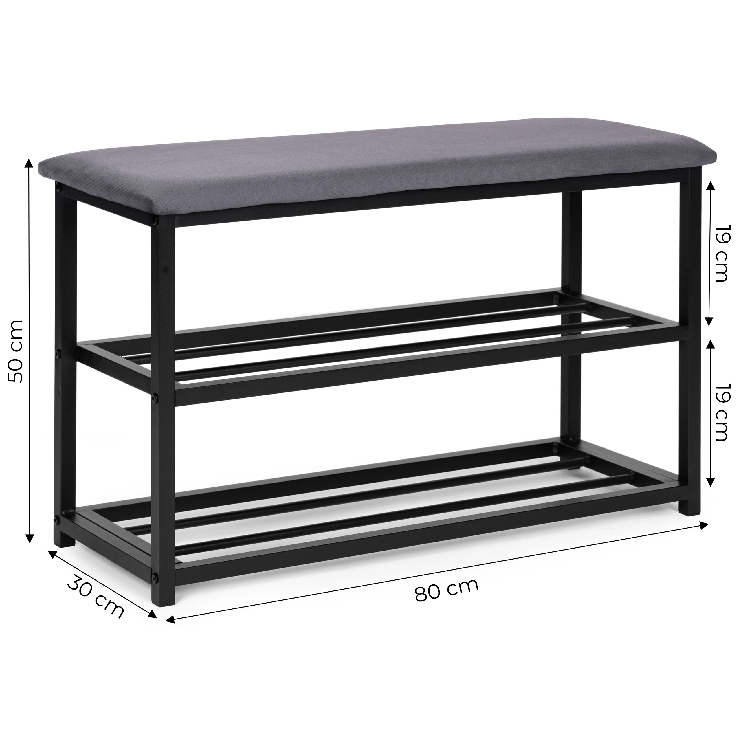 Stilska klupa za cipele ModernHome spaja prostor za odlaganje i udobno sjedenje u jednom. Zahvaljujući dvjema policama prima do 8 parova obuće, a njezino mekano baršunasto sjedalo olakšava obuvanje. Čelični okvir s praškastim premazom osigurava stabilnost i dug vijek trajanja, dok otvorene police pružaju preglednost i prozoravanje obuće. Idealna za predsoblje, garderobu i ugradbene ormare.