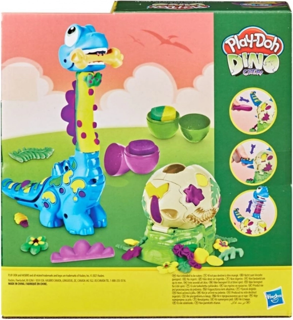Pomozite malom Brontu izaći iz jajeta i gledajte kako mu raste vrat! Dovoljno je napuniti figuricu PLAY-DOH-a i pritisnuti rep – vrat će se izvući i zabava može početi. Uz kalupe na figurici i jajetu izradit ćete lišće, cvijeće, kosti i stylish leptir-mašnu.