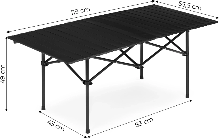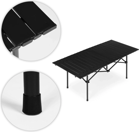 Lamelna (rolajuća) ploča pruža ugodno ravan površinski sloj koji se lako čisti i dobro odvodi vodu. Protuklizne kapice povećavaju stabilnost na travi, zemlji i pločicama. Brzo sastavljanje bez alata i kompaktne dimenzije nakon pakiranja čine ga idealnim stolom za izlete, piknike i roštilje.