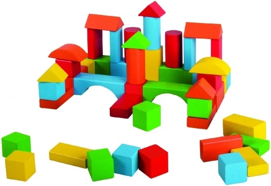 Šarena drvena građevna konstrukcija sadrži 50 kvalitetno obrađenih kocaka različitih oblika za male graditelje. Potiče finu motoriku, kreativnost i prostornu maštu. Izrađeno od sigurnog drva, ispunjava EU norme i prikladno je za djecu od 2 godine.