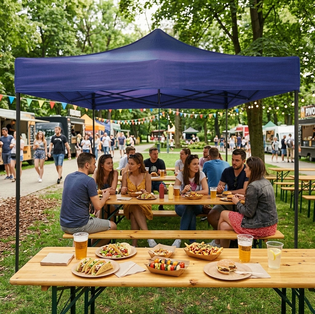 Krov 420D i zidovi 210D s PVC premazom odbijaju vodu i štite od UV zračenja. Idealno za sezonsku upotrebu na tržnicama i vrtnim okupljanjima.