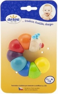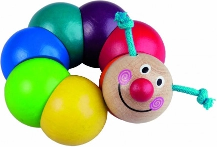 Ova simpatična gusjenica marke DETOA izrađena je od kvalitetnog drva i šarenih perlica nanizanih na elastičnoj gumici. Pri stiskanju i savijanju gusjenica se pomiče, što djecu zabavlja i pritom prirodno vježba njihov hvat i koordinaciju oko–ruka.