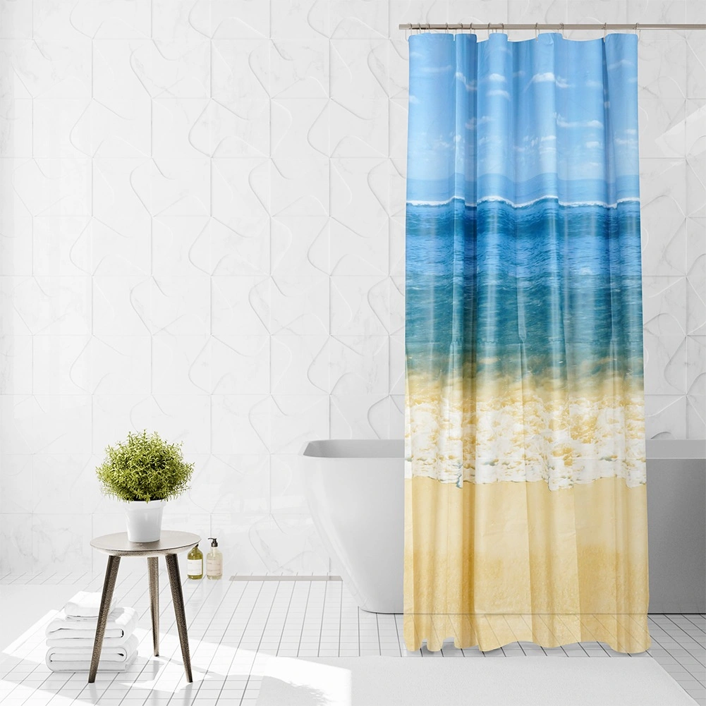 Unesite ljetnu atmosferu u svoju kupaonicu zahvaljujući realističnom tisku mora i pješčane plaže. Zavjesa od materijala PEVA bez štetnih tvari, ekološki je prihvatljiva i otporna na vlagu. U pakiranju se nalazi 12 bijelih kukica za brzu i stabilnu ugradnju na šipku (šipka nije uključena).