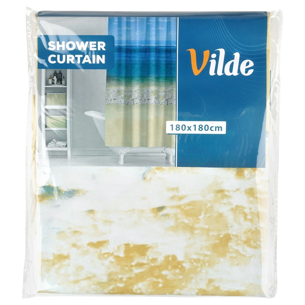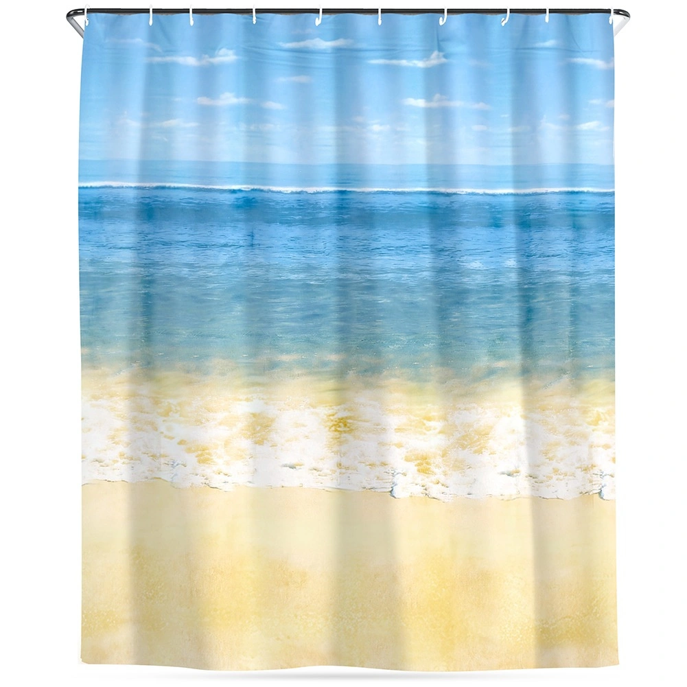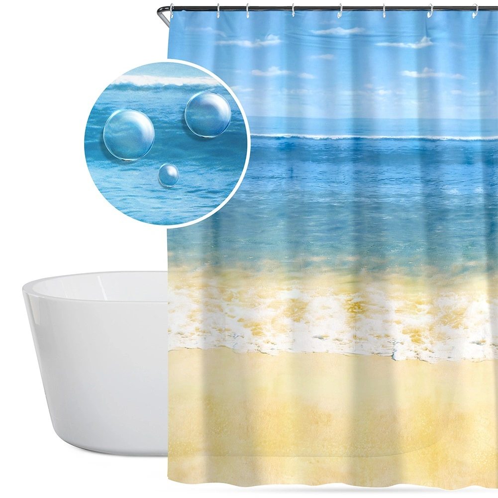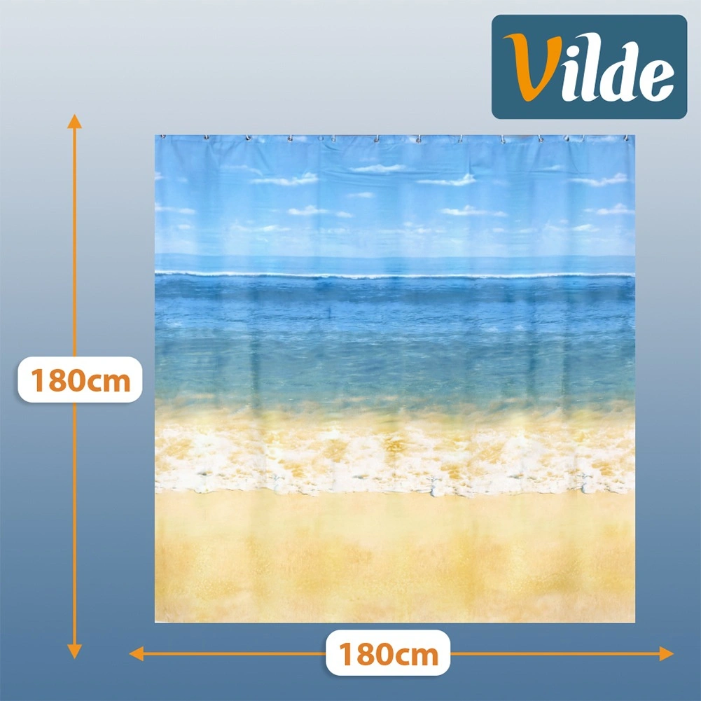 Stilna zavjesa za tuš s motivom plaže dimenzija 180 × 180 cm isporučuje se s 12 kukica. Izrađena od ekološkog PEVA materijala, vodootporna je, lako se čisti te pruža privatnost i pouzdanu zaštitu od prskanja vode za većinu kada i tuš kabina.
