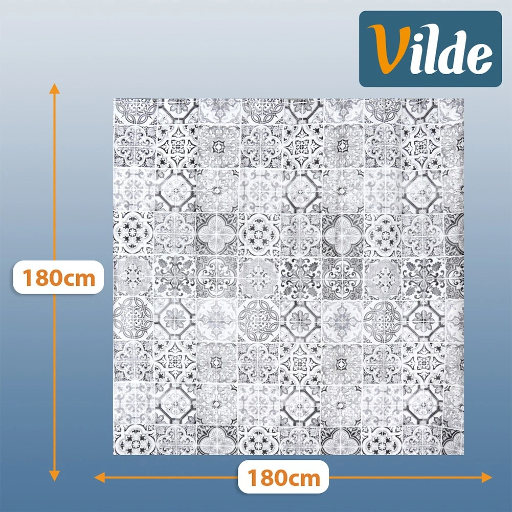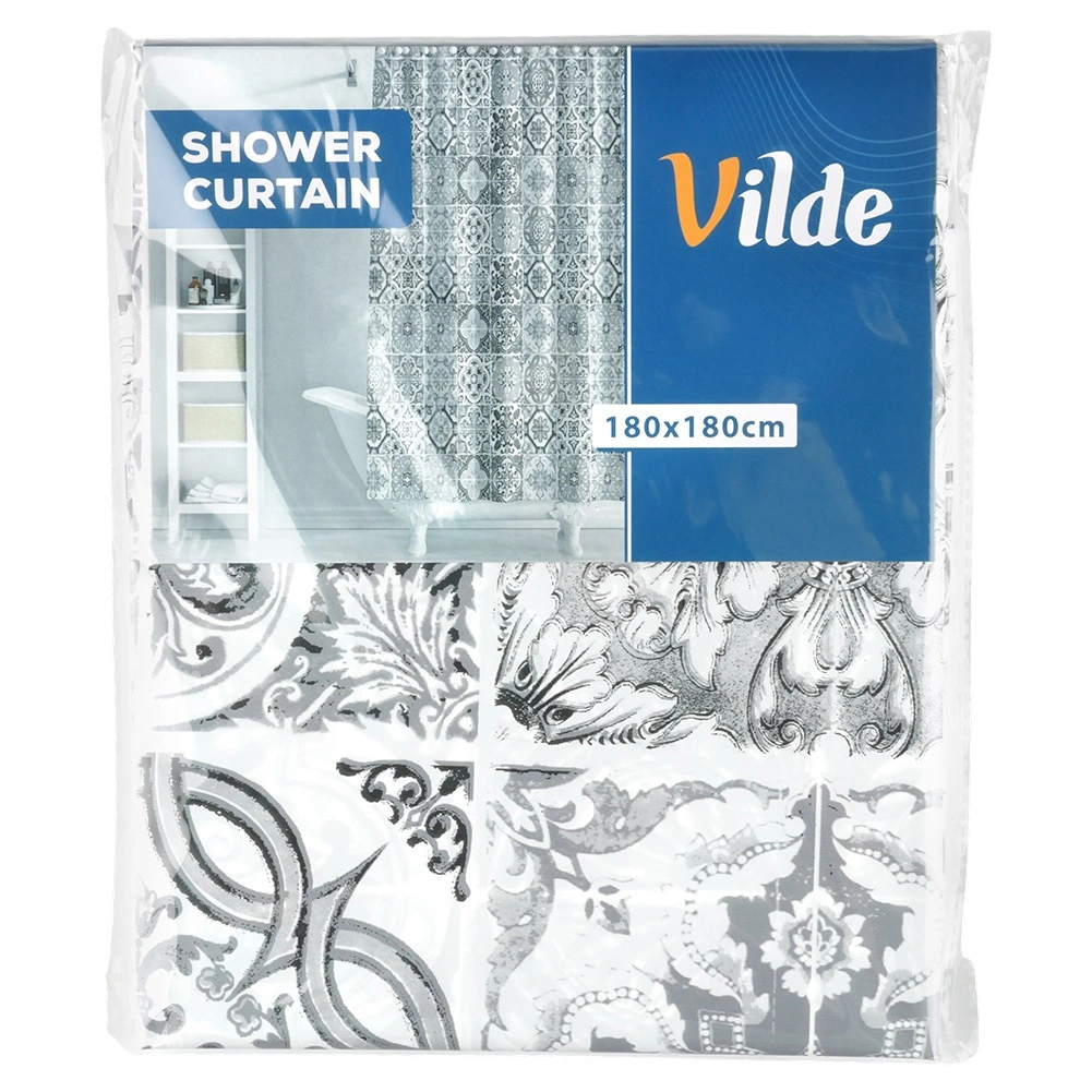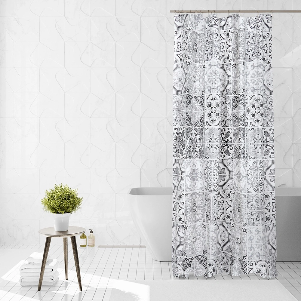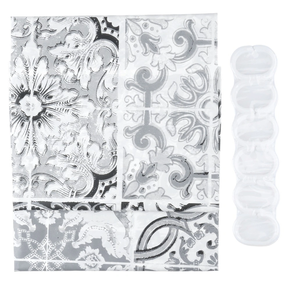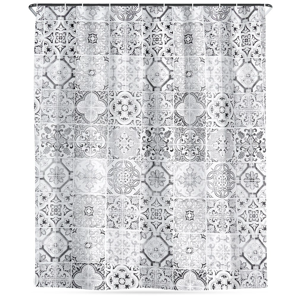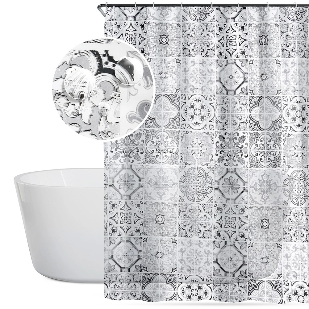 Stilska zavjesa za tuš od ekološkog PEVA materijala dimenzija 180 × 180 cm s 12 kukica u pakiranju. Pruža privatnost, učinkovito sprječava prskanje vode i zahvaljujući vodoodbojnjoj površini lako se čisti. Moderan sivo-bijeli uzorak nadahnut pločicama daje vašoj kupaonici elegantan izgled.