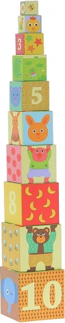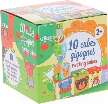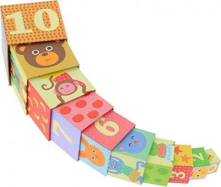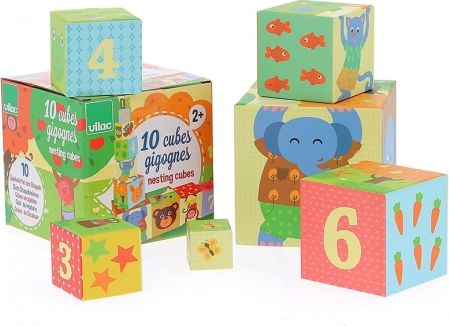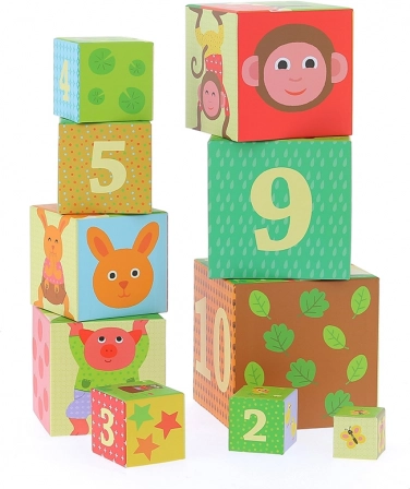 Ova šarena slagajuća kula brenda VILAC sadrži 10 čvrstih kartonskih kocaka s numeriranim stranama i ilustracijama životinja. Djeca mogu kocake slagati u visoku kulu ili ih umetati jednu u drugu, čime prirodno vježbaju računanje, razlikovanje veličina i ravnotežu.