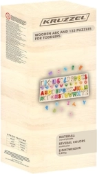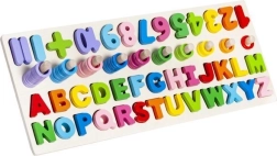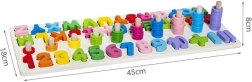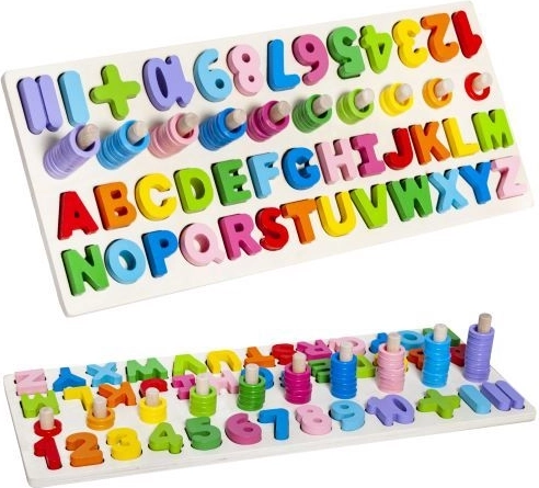 Ova multifunkcionalna drvena slagalica spaja zabavu i učenje u jednom. Djeca kroz igru upoznaju oblike slova i brojki, uče ih imenovati, slagati prve jednostavne riječi te vježbaju brojanje pomoću prstenova na klincima. Žive boje motiviraju na otkrivanje i potiču kreativnost i koncentraciju.
