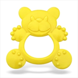 Žuta silikonska grickalica s prstenom lako se drži i idealna je za nježno grickanje i igru.