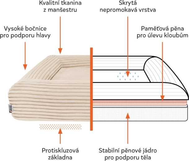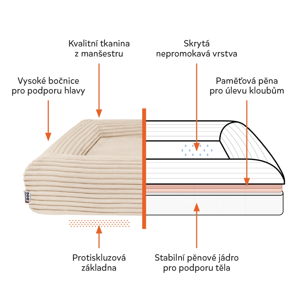 Vodootporni unutarnji sloj štiti jezgru od vlage, a protuklizna donja strana drži krevet na mjestu i na glatkim podovima.