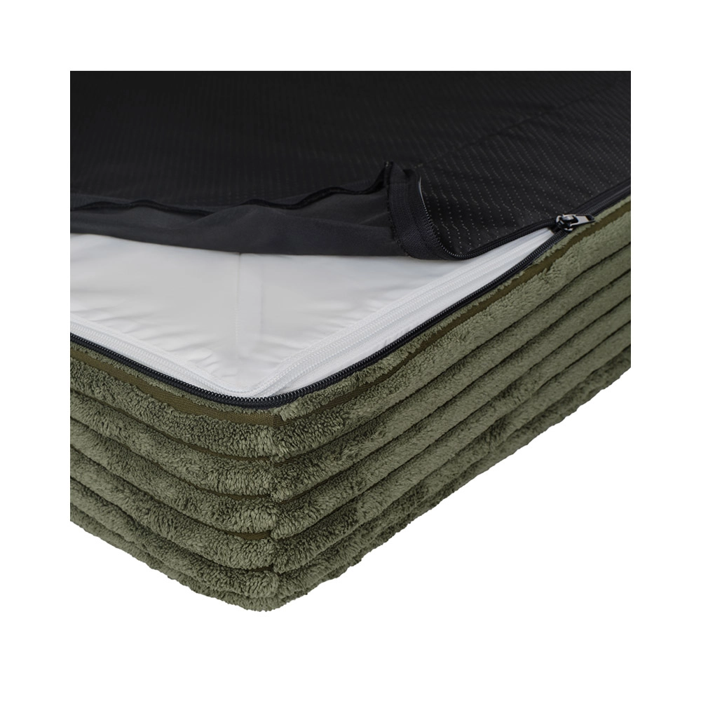 Navlaka od finog manšetra (100% poliester) je mekana, brzo se suši i otporna na neugodne mirise, s certifikatom OEKO-TEX Standard 100. Jezgra od pjene s certifikatom CertiPUR-US ne sadrži štetne tvari. Zahvaljujući YKK zatvaračima navlaka se lako skida i pere u perilici na 30 °C. Vodootporni unutarnji sloj štiti jezgru od vlage, a protuklizna donja strana drži krevet čvrsto na mjestu na pločicama i laminatu.