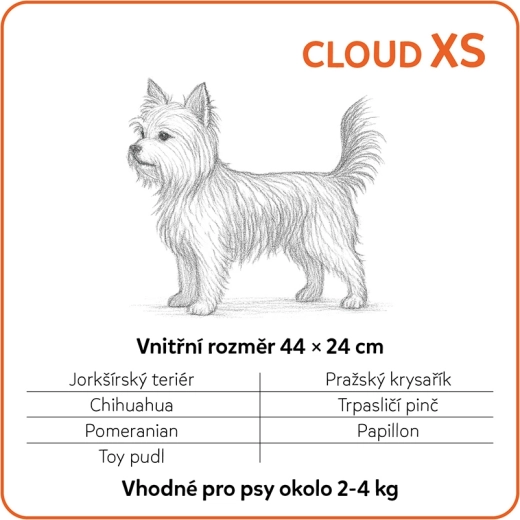 Cloud XS je udoban ortopedski krevet za male pse i štence koji osigurava pravilnu potporu tijelu i tijekom dugog sna. Dvoslojna konstrukcija (4 cm PUR + 2 cm memorijske pjene CertiPUR-US) ravnomjerno raspoređuje pritisak, ublažava udarce i donosi primjetno olakšanje opterećenim zglobovima i kralježnici. Visoke bočne stranice (13 cm) podupiru glavu i stvaraju mirno, ugodno i zaštićeno mjesto za odmor.