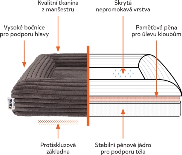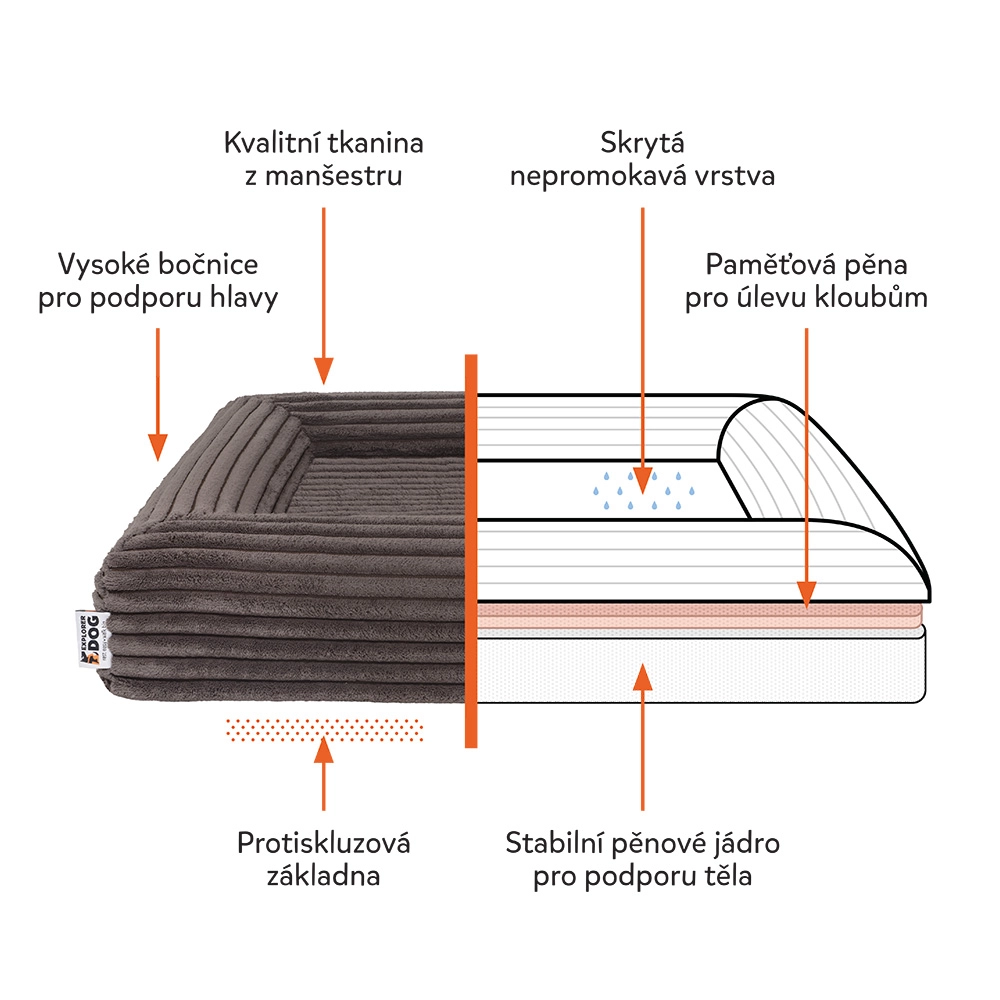 Vodootporni unutarnji sloj štiti pjenu od vlage i nečistoća, dok protuklizna donja strana sprječava pomicanje kreveta po glatkim podovima.