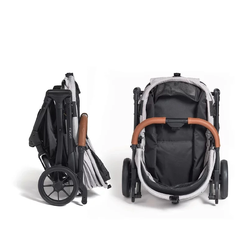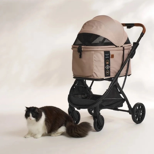 Elegantna kolica za kućne ljubimce sa skandinavskim dizajnom, koja se sklapaju jednom rukom i samostalno stoje nakon sklapanja. Nude ekstra prostranu košaru, vodootpornu recikliranu nadstrešnicu s mrežastim prozorčićem za ventilaciju te amortizirane okretne kotače od EVA pjene za udobnu vožnju i na zahtjevnijem terenu. Praktična košara do 3 kg i ručica od PU kože osiguravaju udobnost na svakoj šetnji.