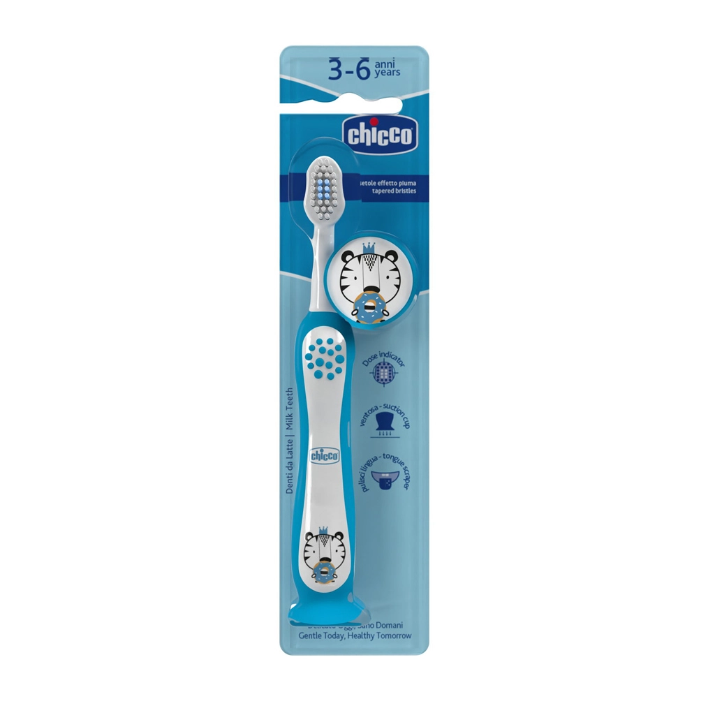 Dječja zubna četkica Chicco Tiger posebno je dizajnirana za djecu u dobi od 3–6 godina. Ima ekstra mekane stožaste dlačice za nježno čišćenje zubi i desni, ergonomsku protukliznu dršku i usku glavu za jednostavan pristup svim mjestima u ustima. Dio pakiranja je higijenski poklopac, prijanjalica za stabilno odlaganje i indikator ispravne količine paste u sredini glave.
