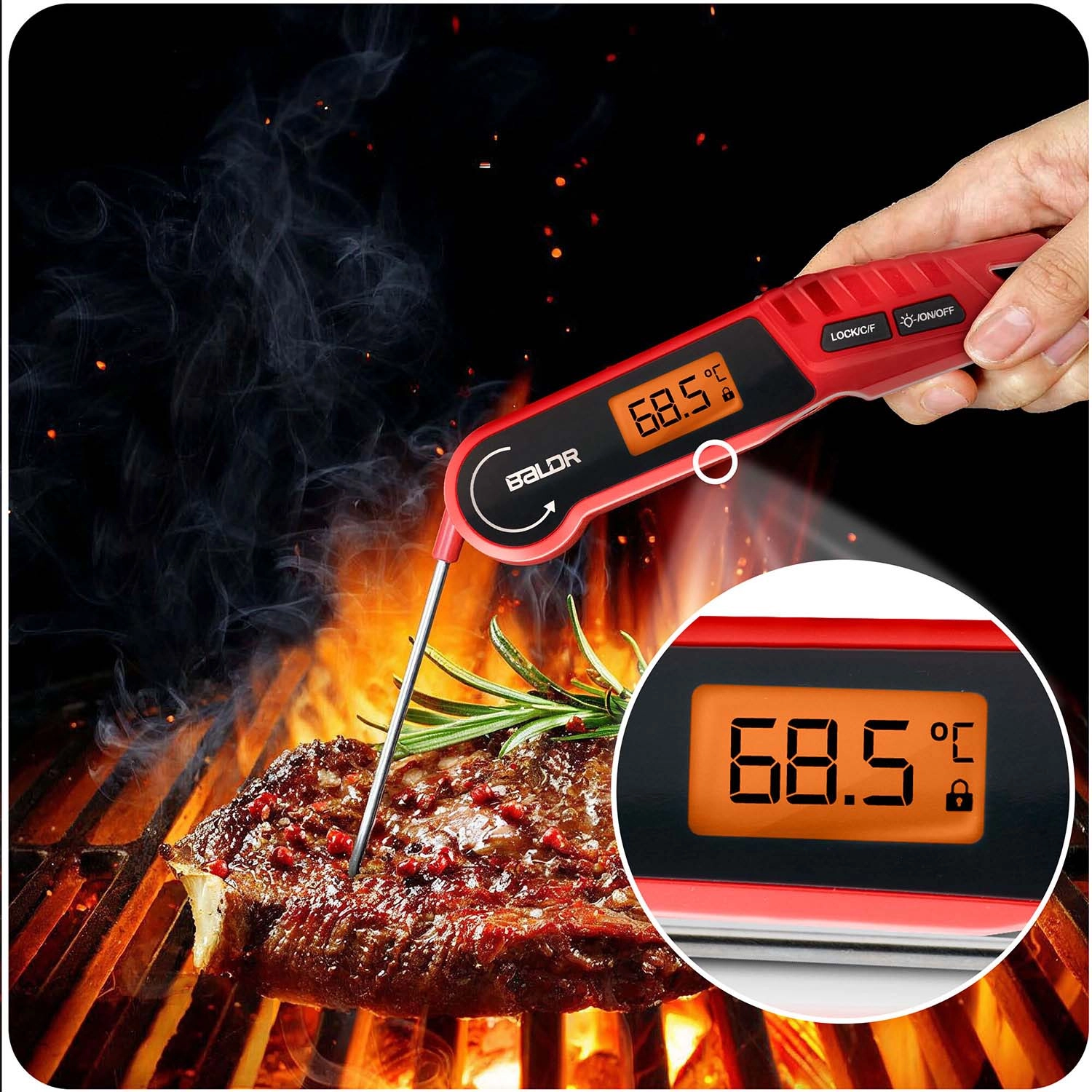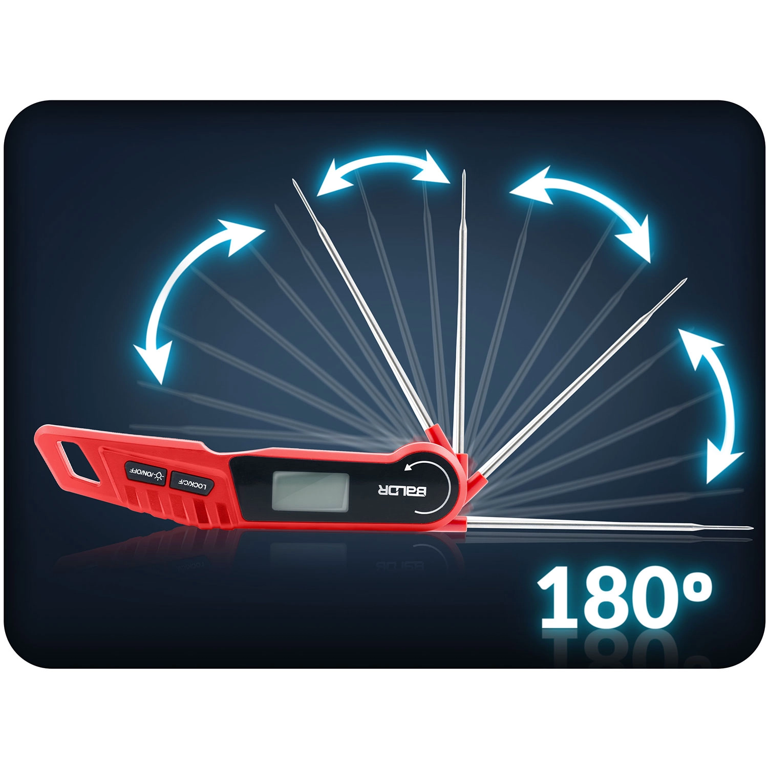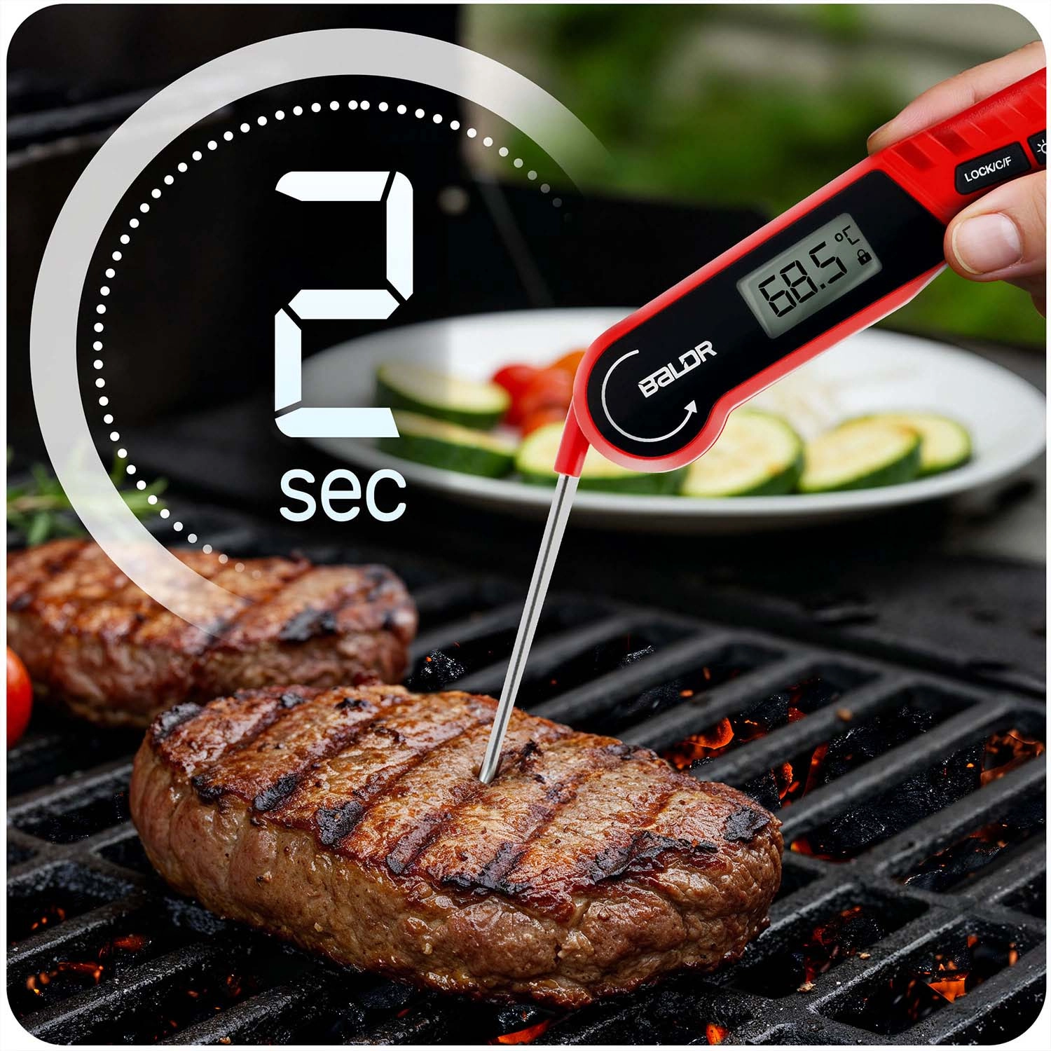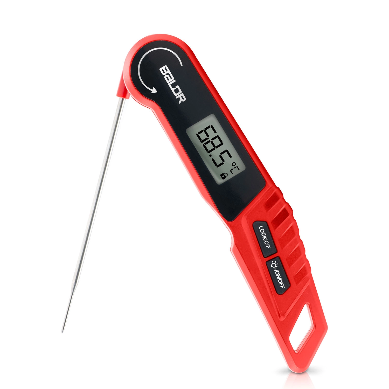 Brz i precizan kuhinjski termometar BALDR BD-130 s preklopnom čeličnom sondom mjeri temperaturu u rasponu -50 °C do 300 °C tijekom 2–3 sekunde s točnošću ±1 °C. Nudi pozadinski osvijetljen LCD zaslon, automatsku rotaciju prikaza, prebacivanje °C/°F, funkciju LOCK, vodootpornost IPX6 i jak magnet za jednostavno pričvršćivanje na metalne površine – idealno za kuhinju i roštilj.