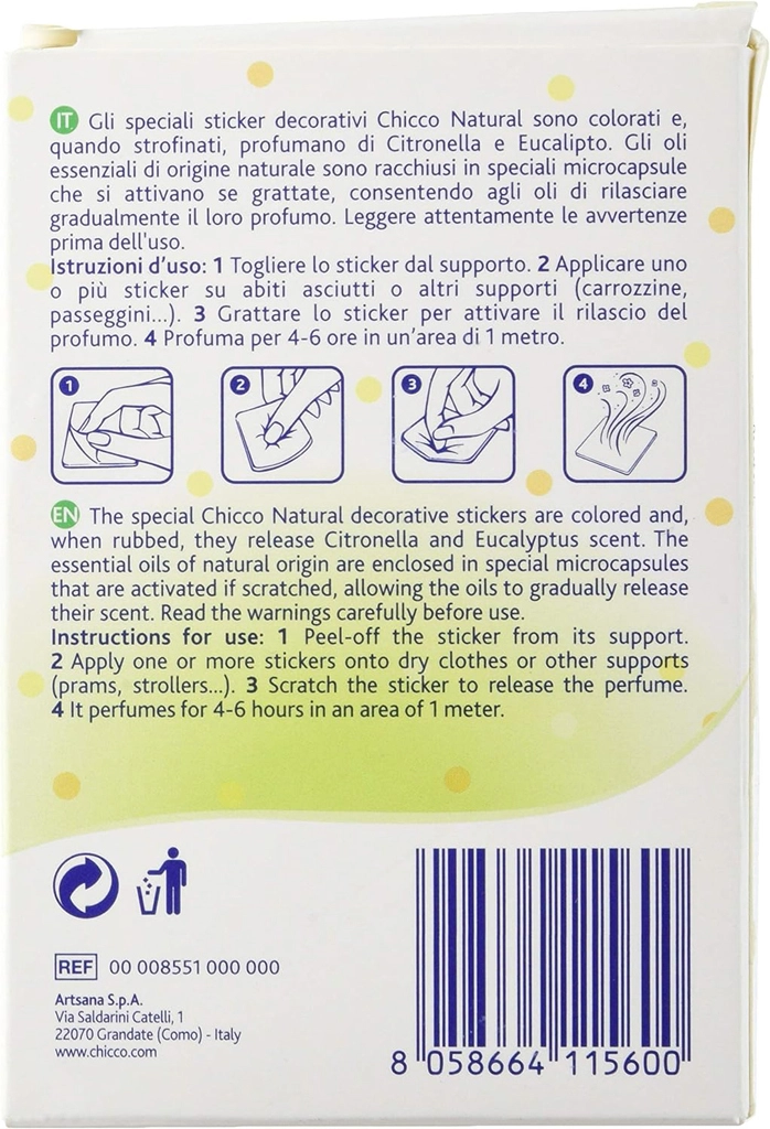 Zaštitite sebe i svoju djecu od napornog insekata s prirodnim mirisnim naljepnicama Chicco. Zahvaljujući eteričnim uljima (limunska trava i eukaliptus citriodora) i mikrokapsulama miris se otpušta postupno nakon aktivacije trljanjem. Naljepnice su idealne za aktivnosti na otvorenom, izlete i svakodnevnu upotrebu.