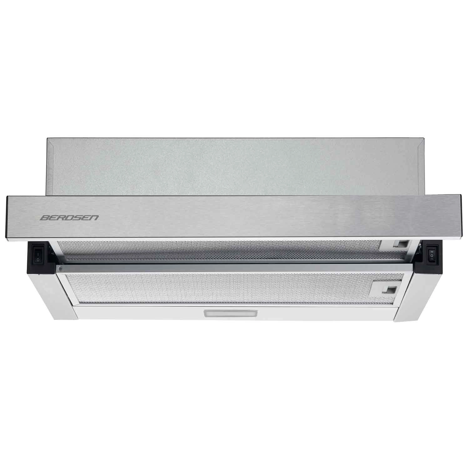 Kompaktna teleskopska napa BERDSEN BT-229 u inox izvedbi nudi učinkovito usisavanje do 200 m³/h, štedljivo LED osvjetljenje i 2 načina rada: odvod ili recirkulacija. Zahvaljujući izvlačnom prednjem panelu povećava se površina hvatanja pare, dok višeslojni aluminijski masni filteri osiguravaju jednostavno održavanje. Elegantan, nenametljiv dizajn štedi prostor i sjajno se uklapa u svaku kuhinju.