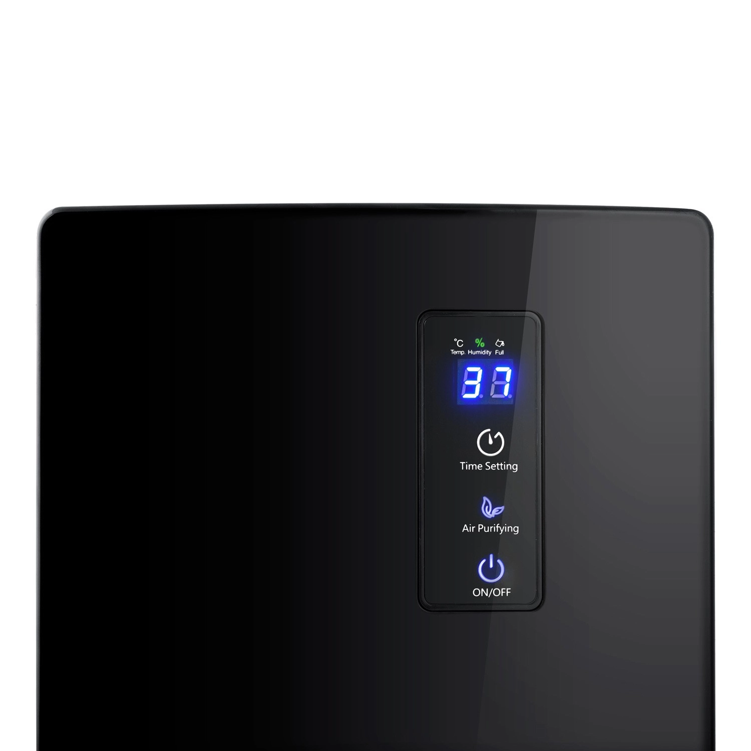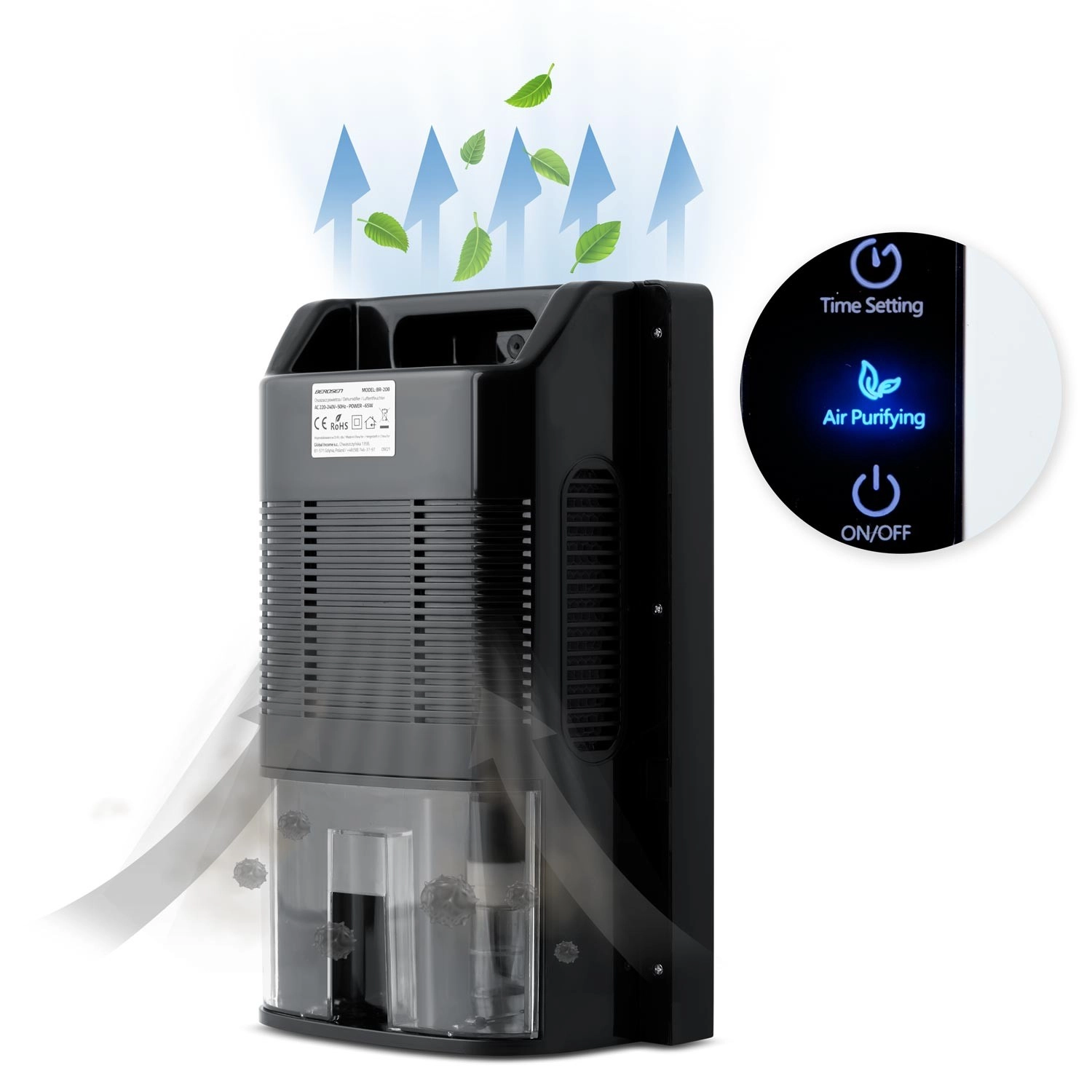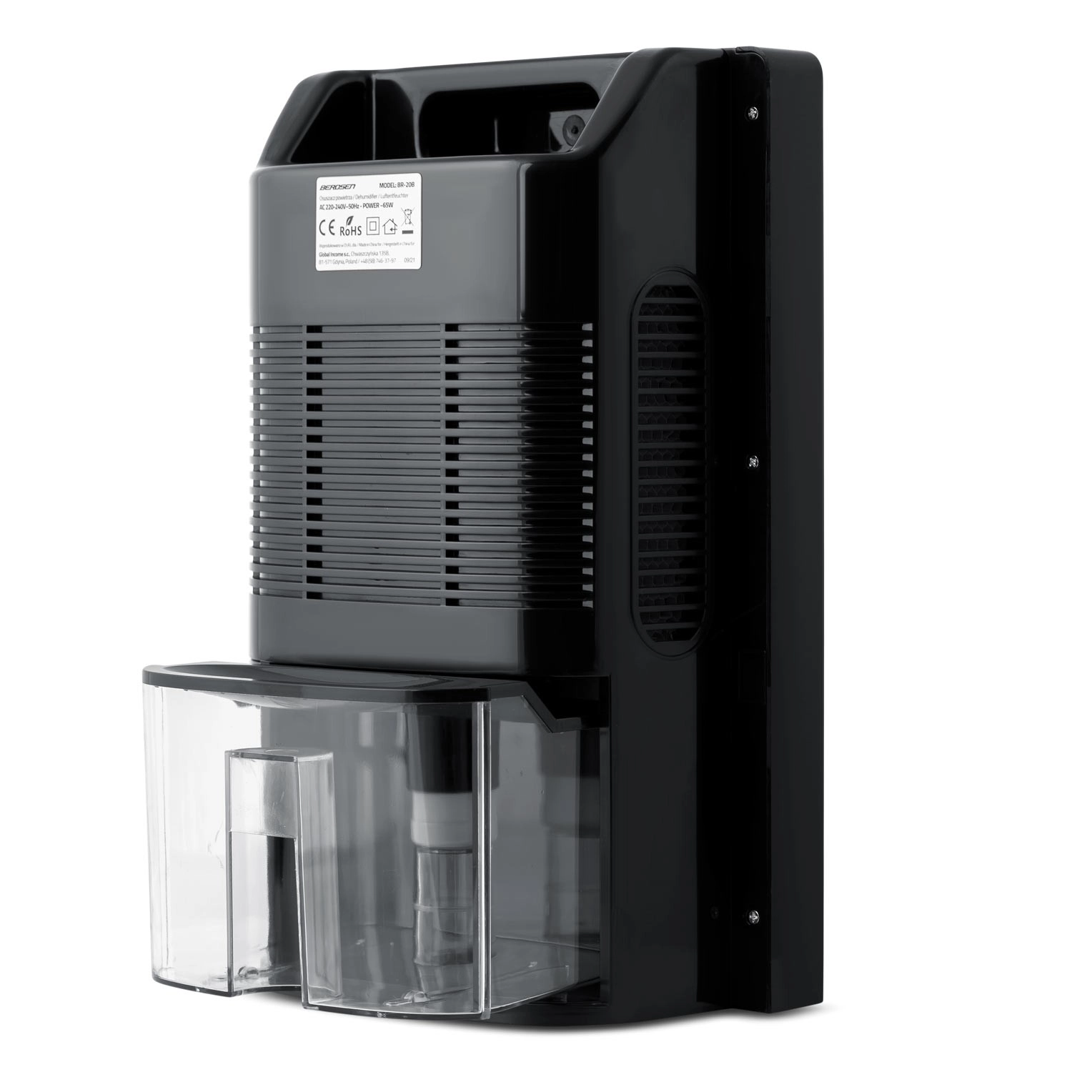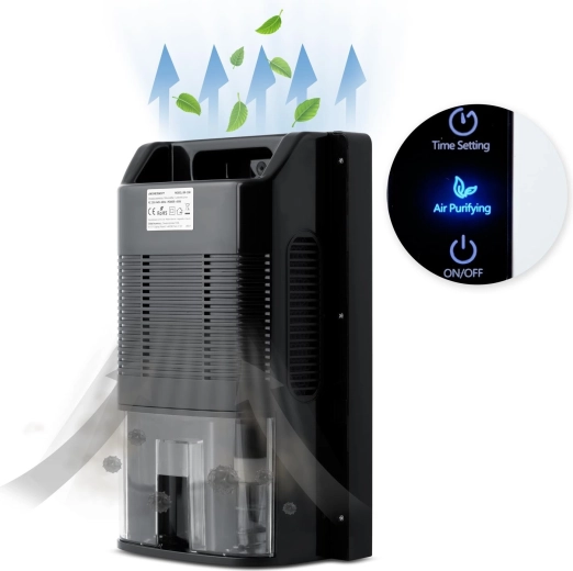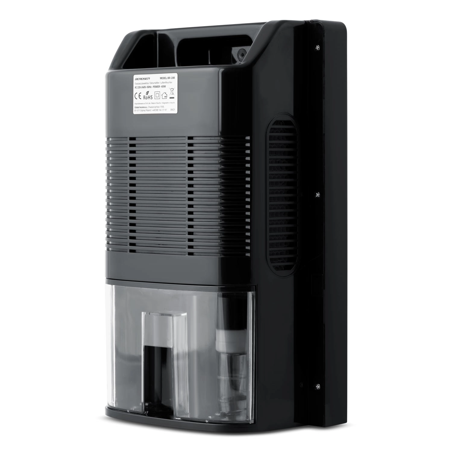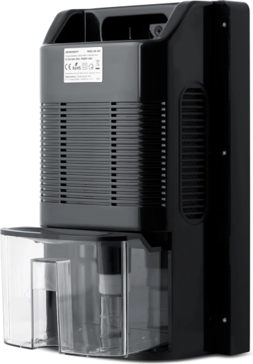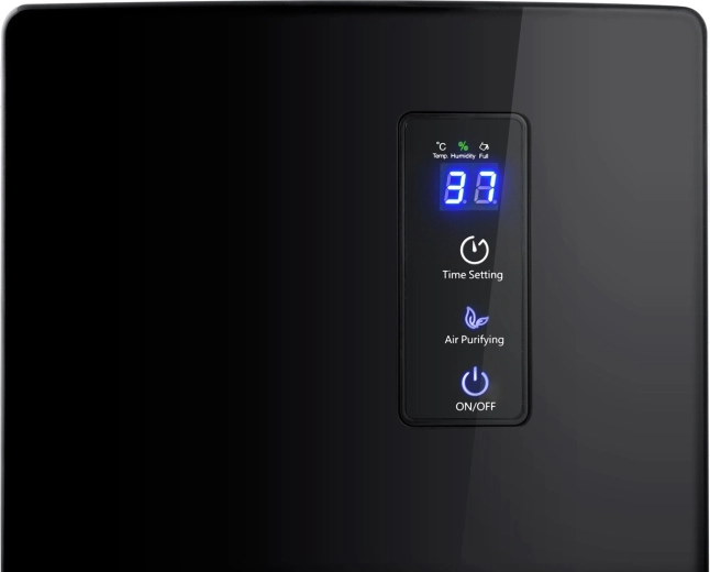 Termoelektrična Peltier tehnologija pouzdano kondenzira vlagu bez upotrebe kemikalija. Pregledna dodirna LED upravljačka ploča prikazuje sve ključne informacije, a timer 1–24 h olakšava planiranje rada. Detektor razine vode pri punjenju spremnika (2 l) automatski isključuje uređaj i upozorava promjenom boje kontrolne lampice.