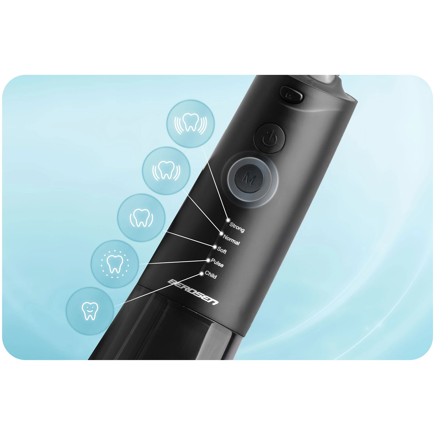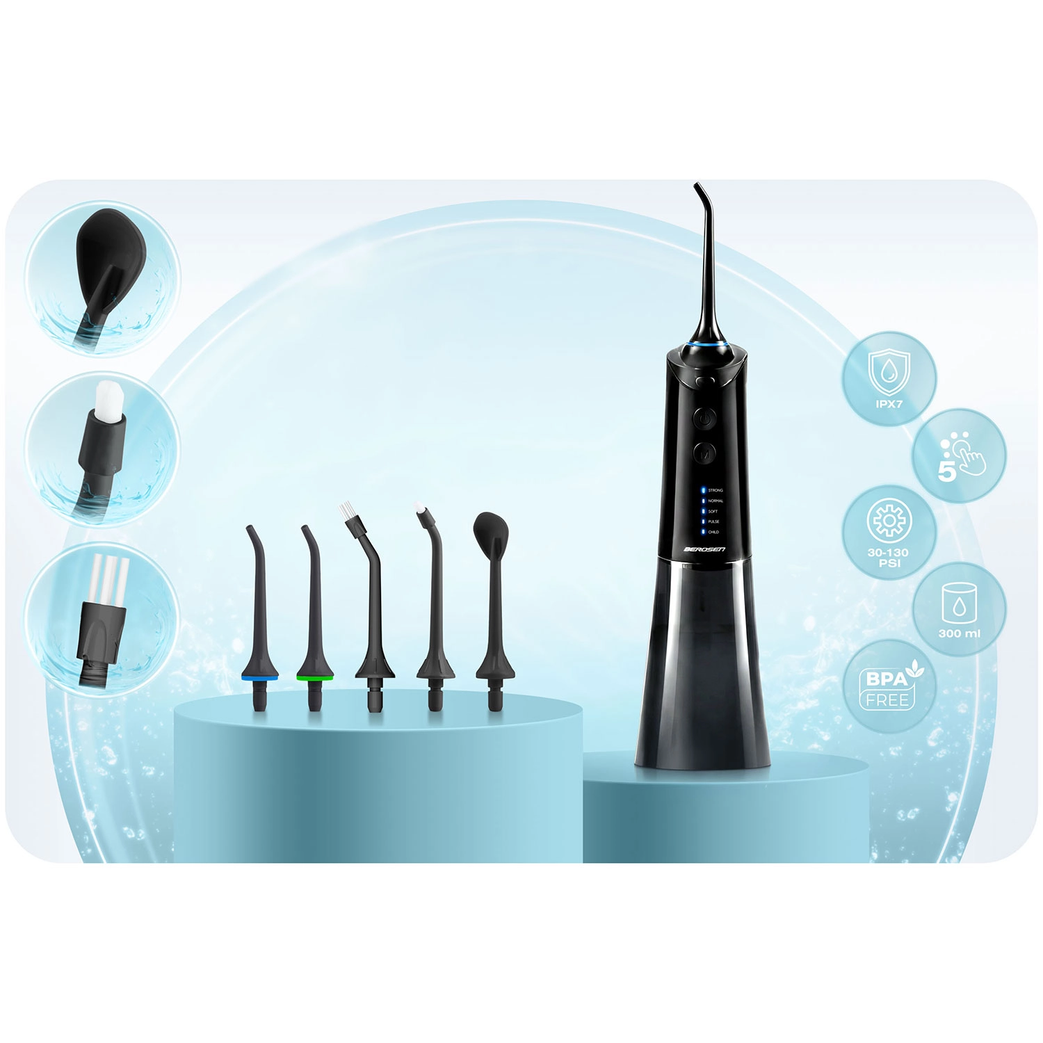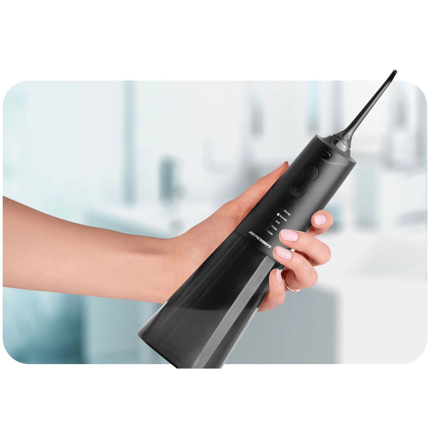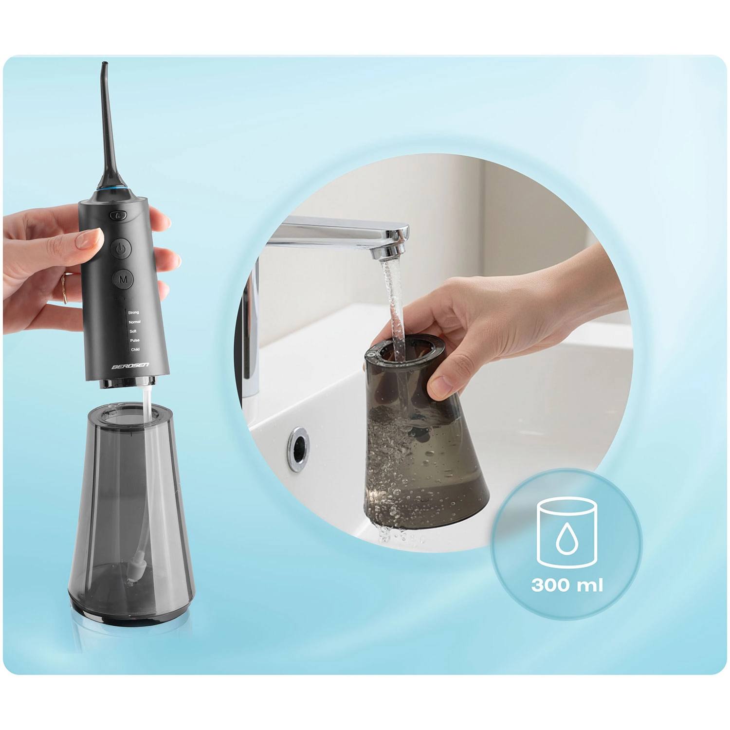 Postignite temeljito, a nježno čišćenje međuzubnih prostora i linije desni. Irigator Berdsen spaja snažne performanse s udobnošću: do 1800 pulsova/min za učinkovito ispiranje plaka i ostataka hrane, pet radnih načina od nježnog do pulsirajućeg te veliki spremnik od 300 ml za dulje korištenje bez prekida.