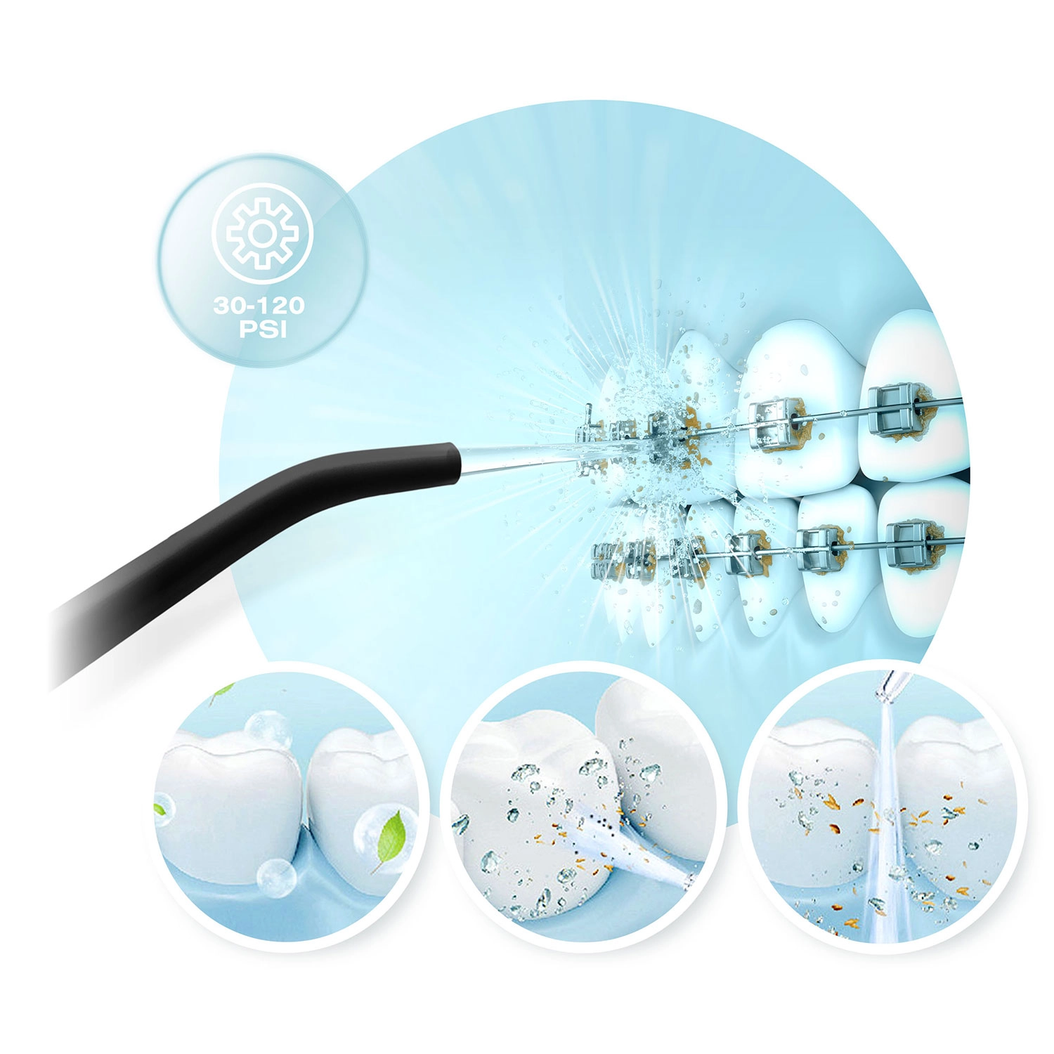 U pakiranju se nalazi 5 nastavaka za različite potrebe: standardne mlaznice za svakodnevnu irigaciju (2 kom), nastavak za jezik za svjež dah, ortodontska mlaznica za aparatiće i krunice te parodontalna mlaznica za čišćenje dubljih džepova (preporučuje se koristiti pri nižem tlaku).
