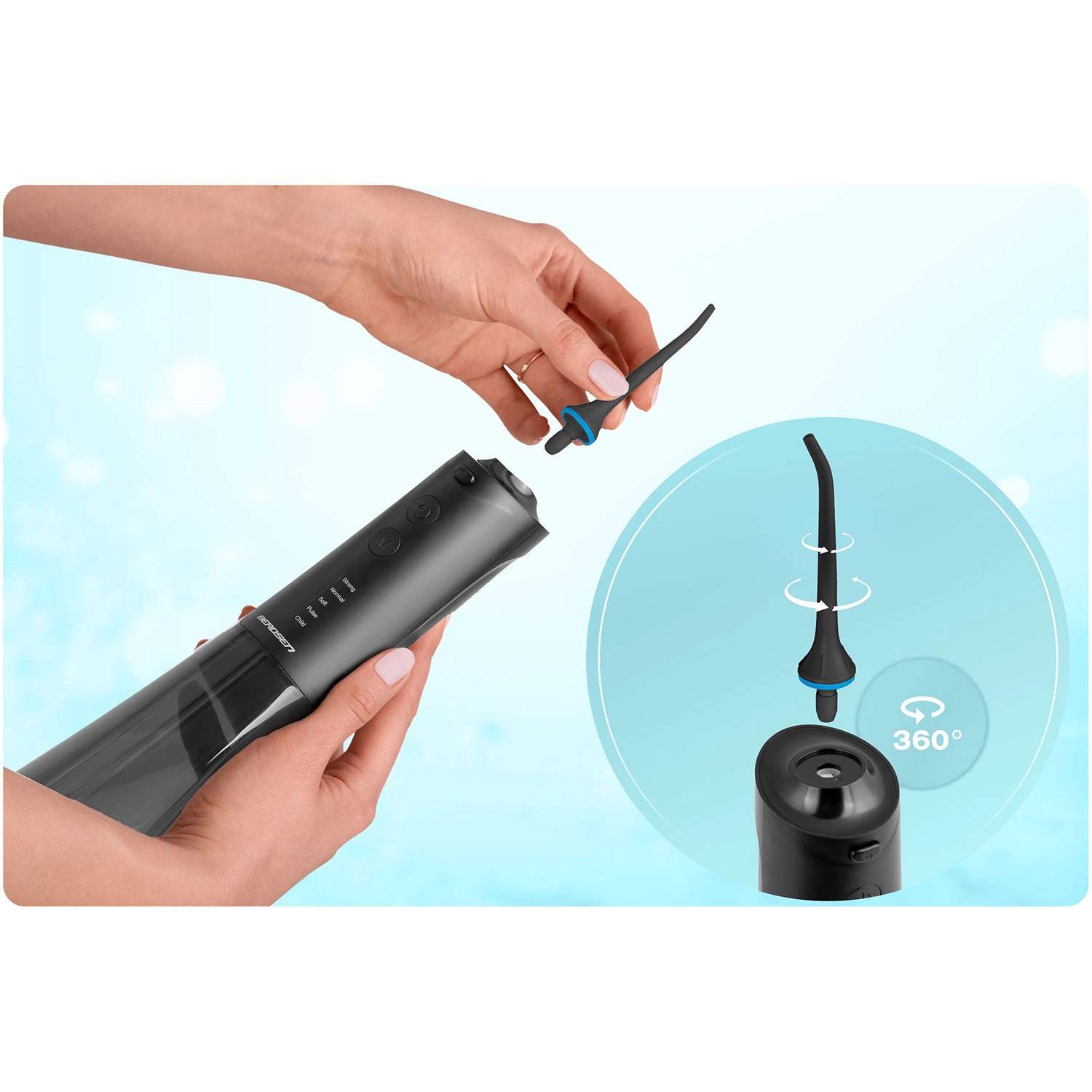 Zahvaljujući rotaciji nastavka od 360° lako ćete dosegnuti sva mjesta, a izmjena nastavaka trenutačna je. Baterija traje približno 30 dana s jednim punjenjem, a punjenje se odvija putem USB‑C. Vodootpornost IPX7 osigurava sigurno korištenje u kupaonici. U pakiranju je i putna torbica, pa irigator možete lako ponijeti na godišnji ili poslovni put.