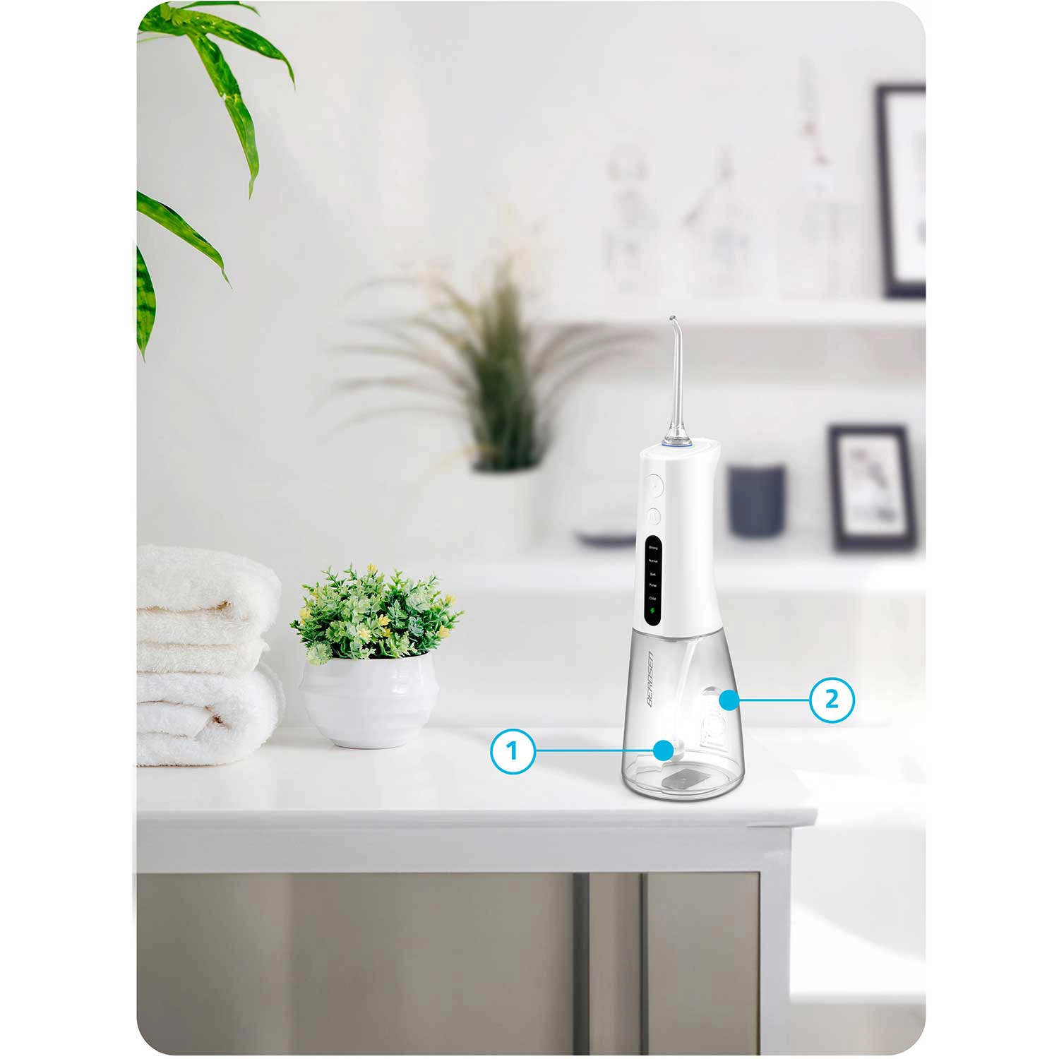 Odaberite između 5 načina rada – Strong, Normal, Soft, Child i Pulse – i prilagodite tlak vode svojim potrebama. Velik spremnik od 300 ml dovoljan je za potpuno ispiranje bez prekidanja, dok rotirajuća mlaznica od 360° olakšava pristup svim površinama zuba i uzduž linije desni. Tih rad ≤72 dB, timer 2 minute i vodootporna konstrukcija IPX7 čine ovaj irigator pouzdanim suputnikom kod kuće i na putu.