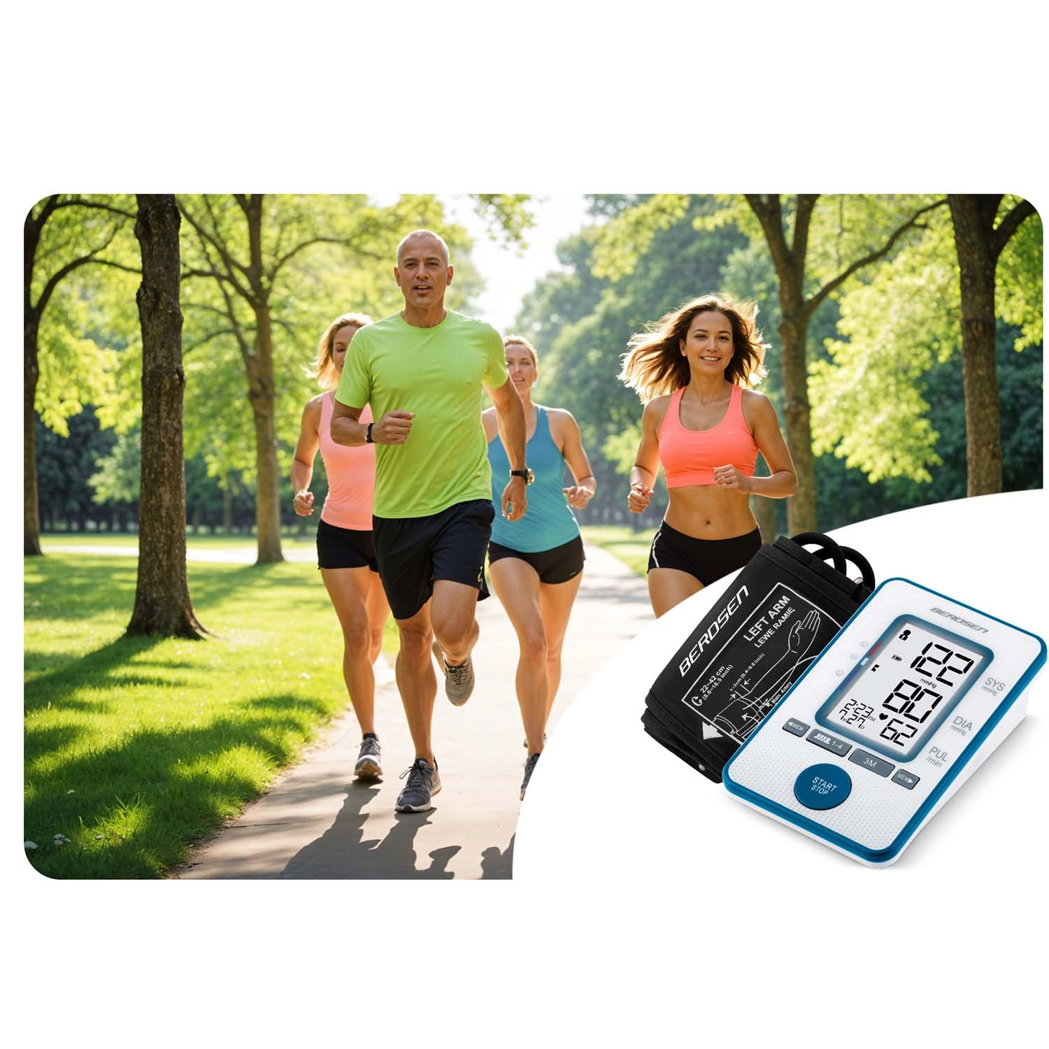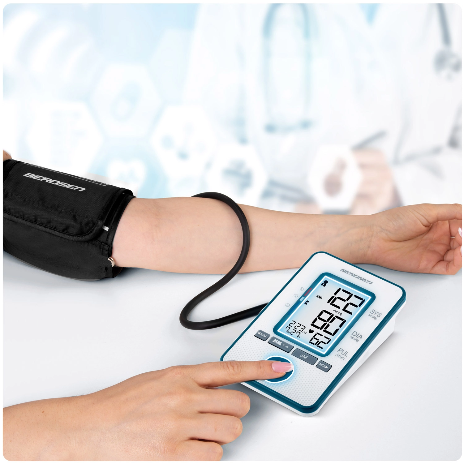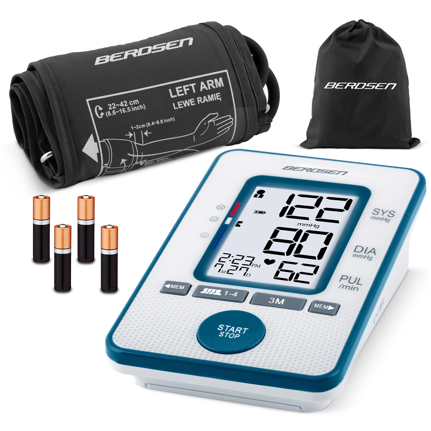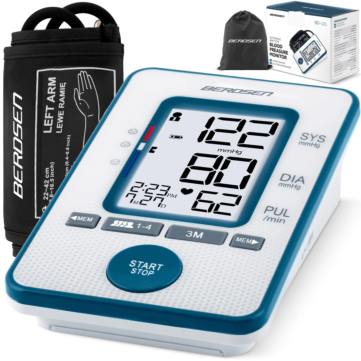 Kućno mjerenje krvnog tlaka nikada nije bilo jednostavnije. Tlakomjer BERDSEN s automatskim upravljanjem jednim gumbom pruža brze rezultate – sistolički/dijastolički tlak i puls – na preglednom zaslonu. Zahvaljujući detekciji nepravilnog pulsa i zvučnim obavijestima, imate kontrolu nad zdravljem svaki dan.