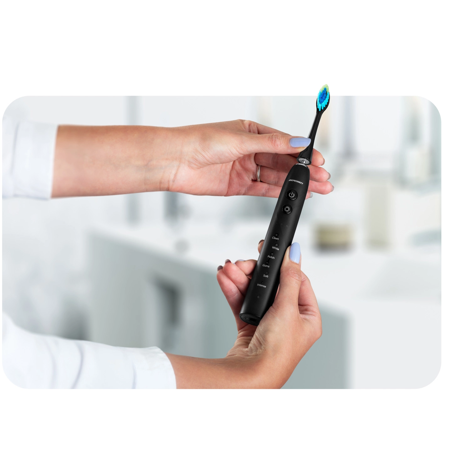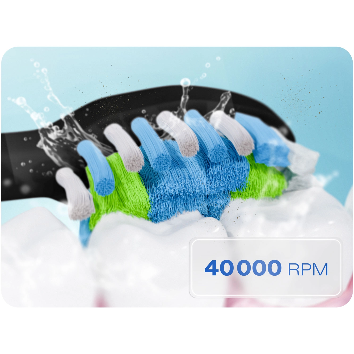 Birajte među 18 kombinacija čišćenja – 6 načina (CLEAN, WHITE, POLISH, GUMS, SOFT, INTENSE) i 3 razine intenziteta za savršeno prilagođavanje vašim potrebama. Snažan motor 40 000 vibracija/min učinkovito razbija zubni plak i pigmentacije, dok vas 2‑minutni timer s 30‑sekundnim intervalom vodi na ispravno podjeljivanje usne šupljine u kvadrante.