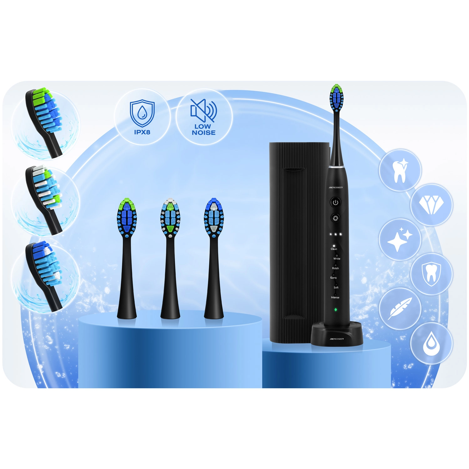 Sonična tehnologija Berdsen Galaxy dopire i do teško dostupnih međuzubnih prostora i pomaže ukloniti do 6× više plaka nego ručna četkica. Posebno oblikovana glava s nježnim, tankim vlaknima prilagođava se svakom zubu, a stražnjom stranom lako očistite i jezik za dugotrajan svjež dah. Elegantno crno izvedenje upotpunjuju ergonomska drška i tih, profesionalan rad.