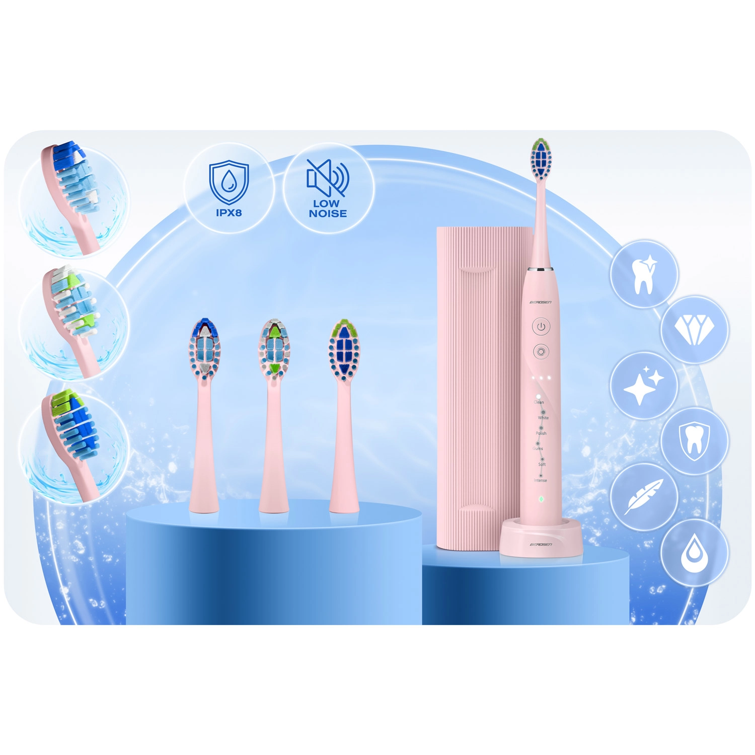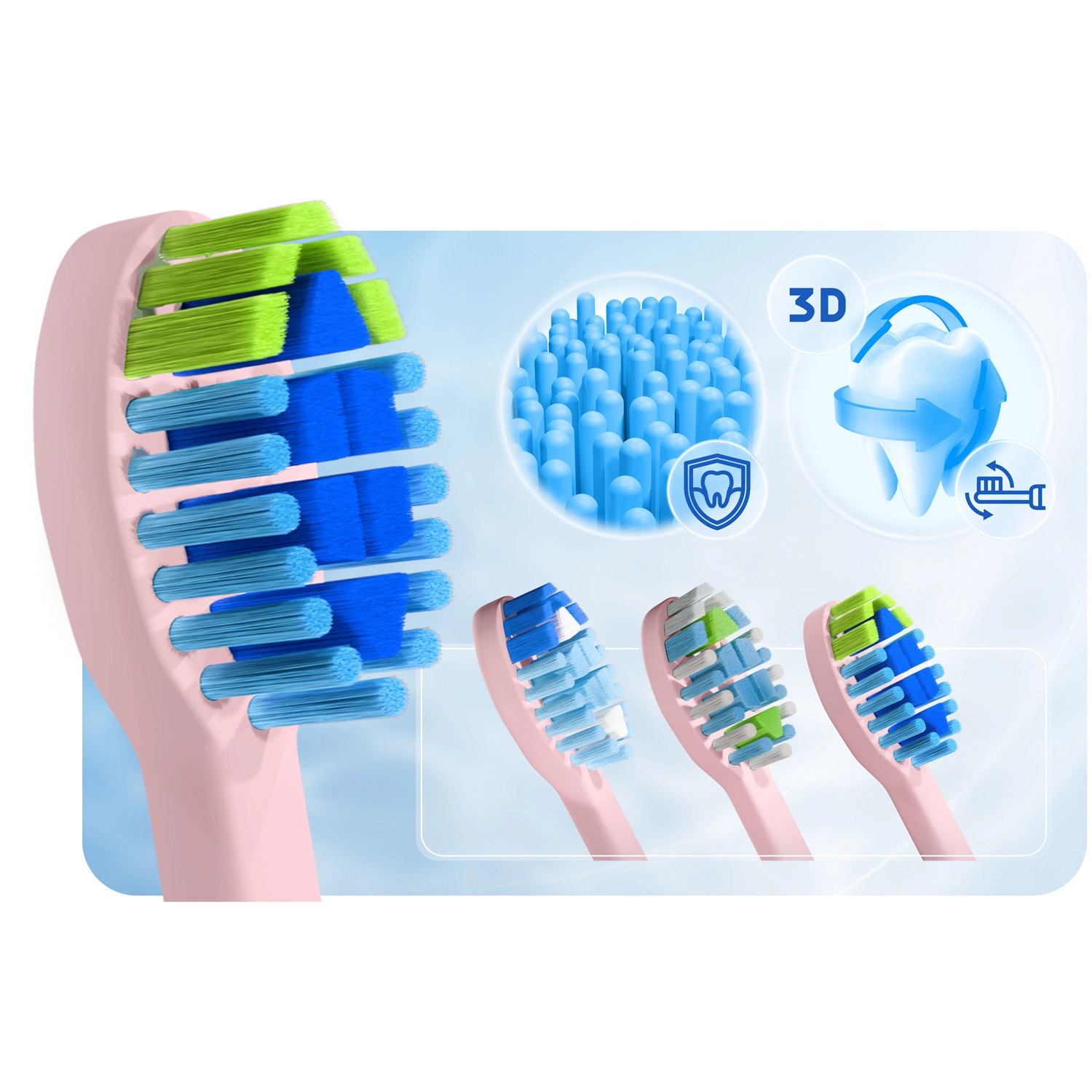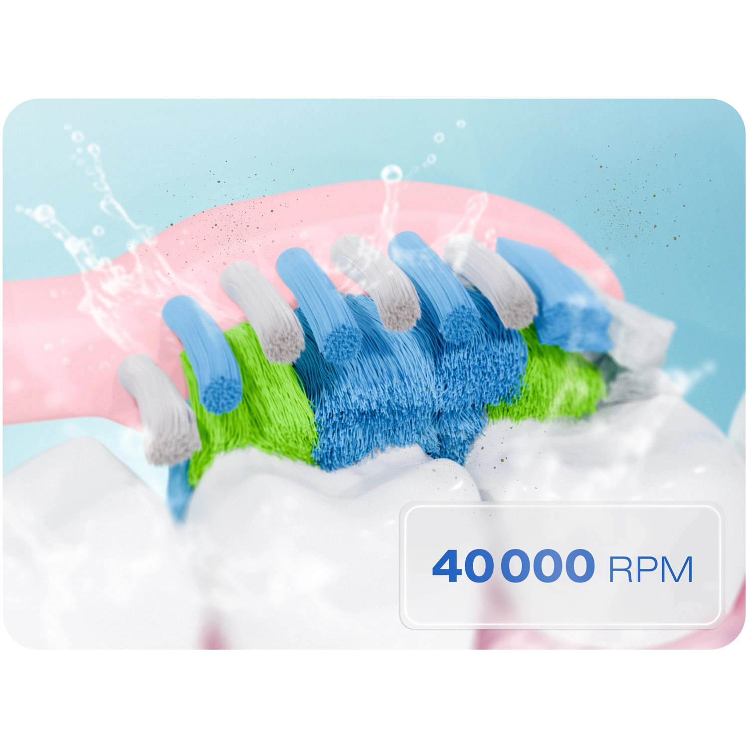 Učinkovito sonično čišćenje s do 40 000 vibracija u minuti brzo uklanja zubni plak i pigmentacije, dok nježna vlakna pažljivo štite caklinu i desni. Glava s inovativnim rasporedom vlakana prilagođava se obliku zuba, a stražnji dio služi kao strugač za jezik za dugotrajan svjež dah.