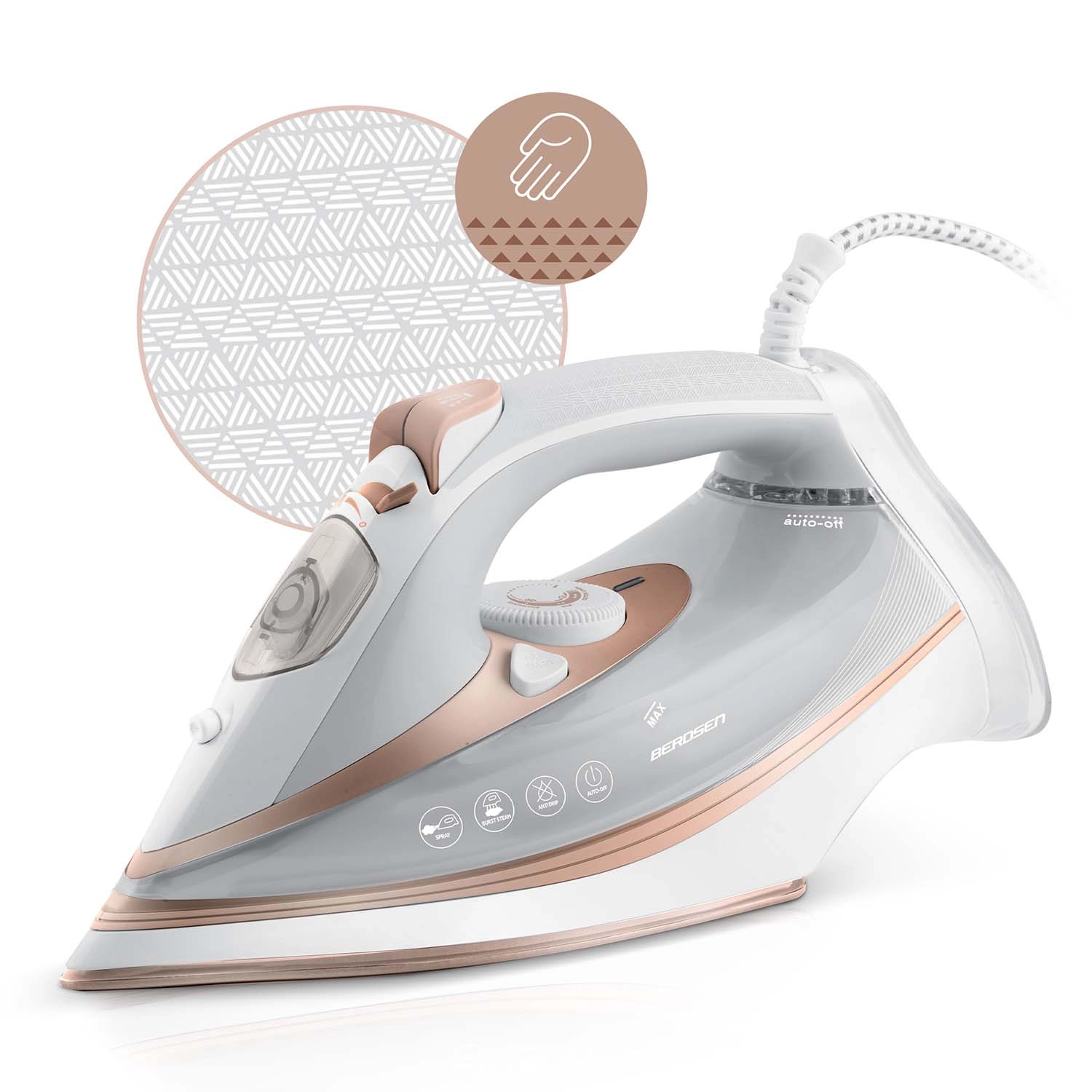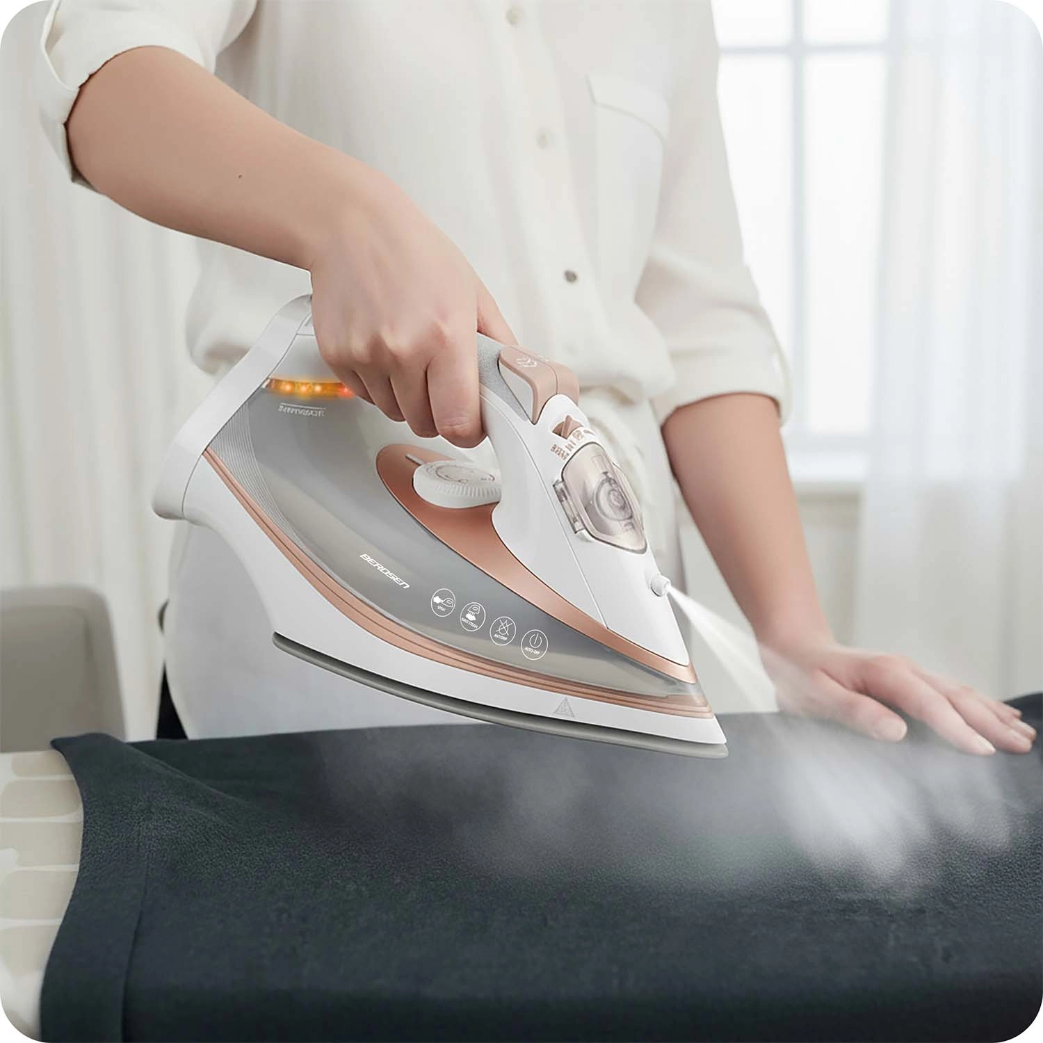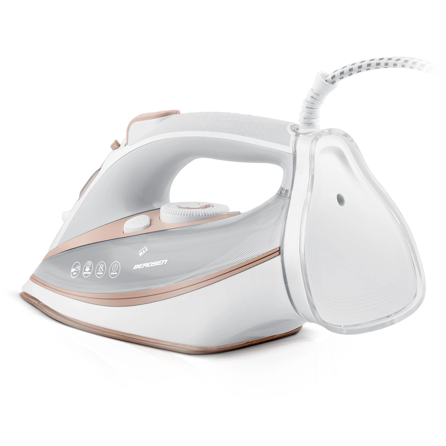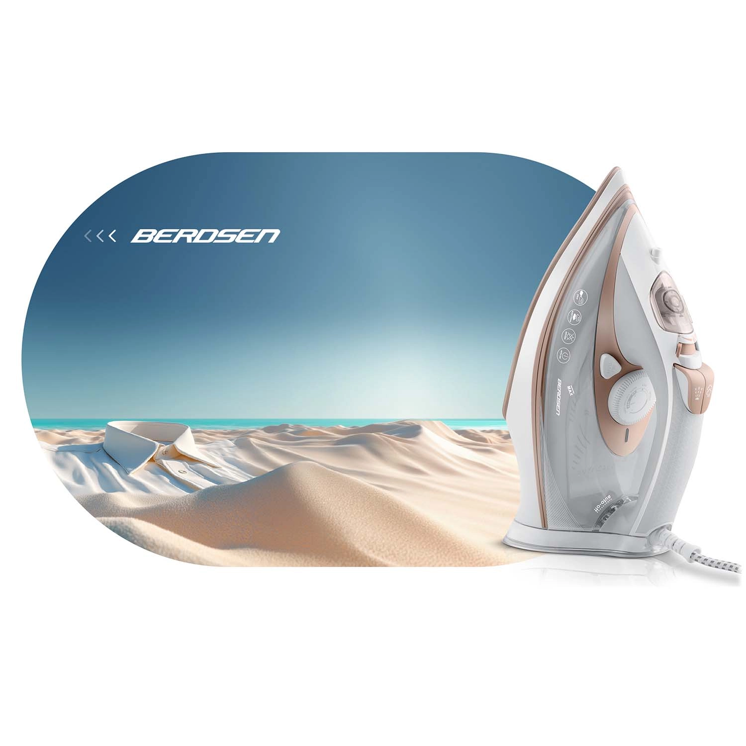 Snažno parno glačalo BERDSEN s priključnom snagom 3000 W nudi dvostruki parni udar, keramičku podlogu za glačanje s mikrokanalićima i vertikalnu paru za brzo i nježno glačanje. Zahvaljujući funkcijama auto-off, zaštiti od pregrijavanja, anti-drip i Self Clean, održavanje je jednostavno, a rad siguran. Veliki spremnik 360 ml, ergonomija i 360° okretni kabel osiguravaju udobno glačanje bez pauza.