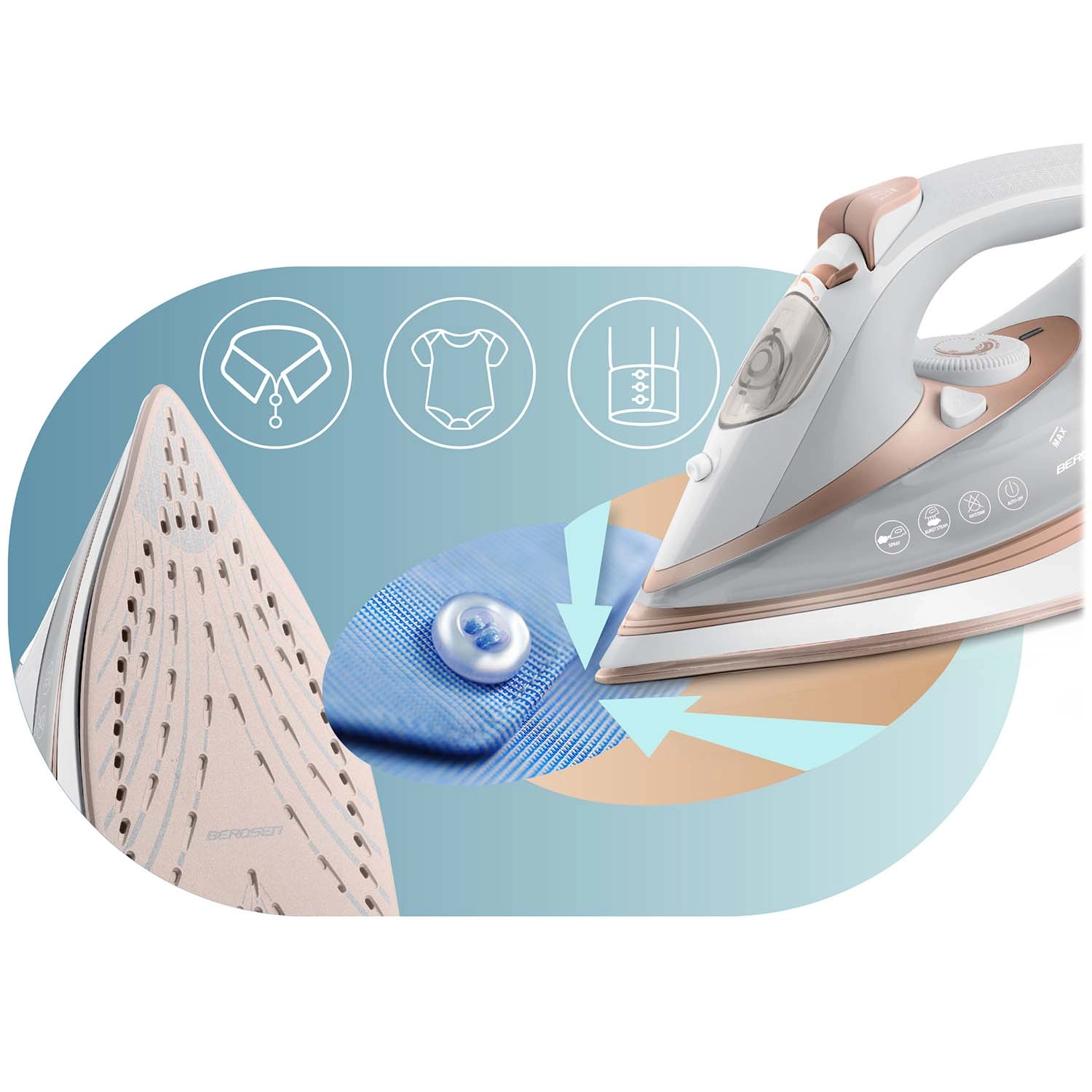 Izdržljiva keramika osigurava vrhunsko klizenje i ravnomjernu raspodjelu topline i pare. Lako dopire između gumba i oko ovratnika.