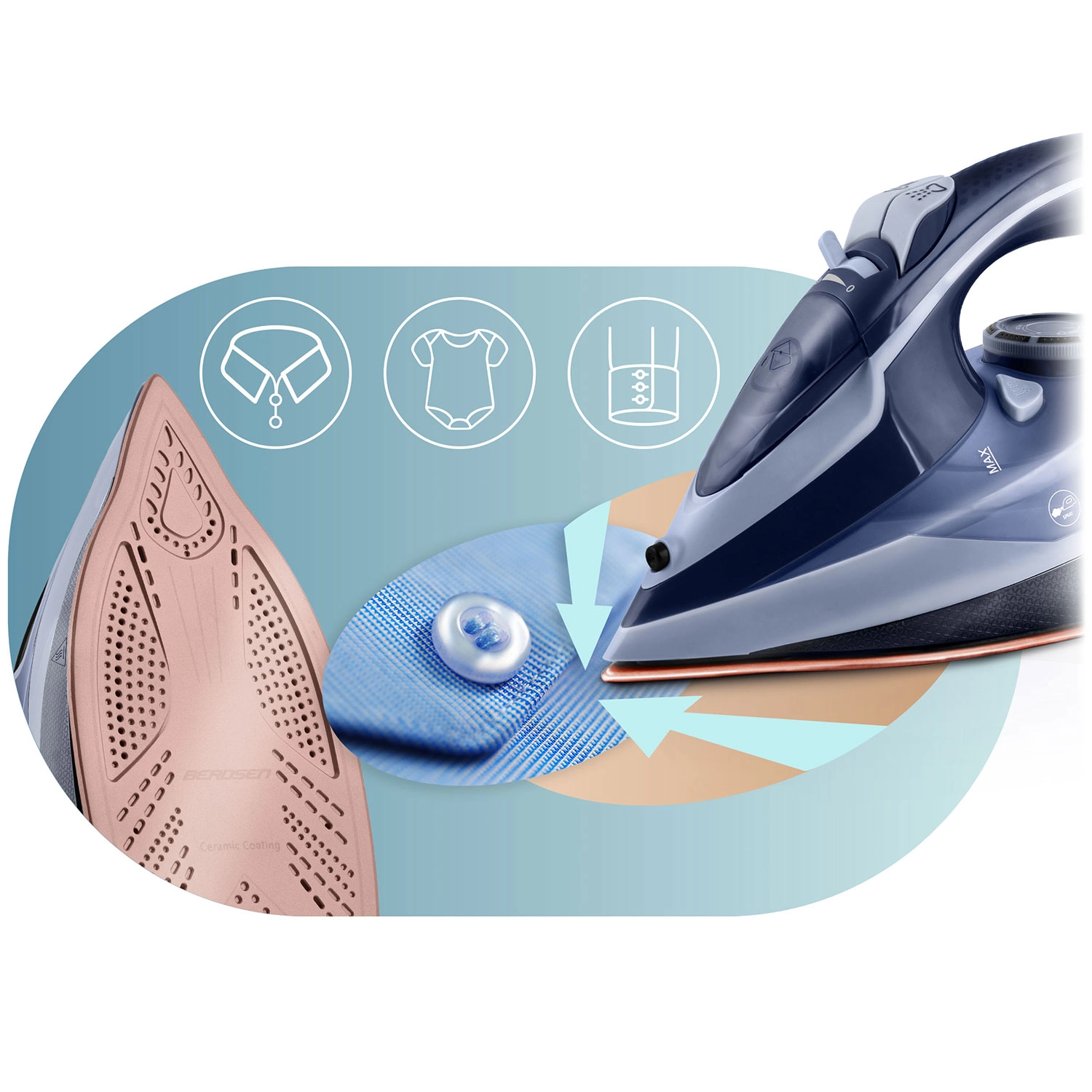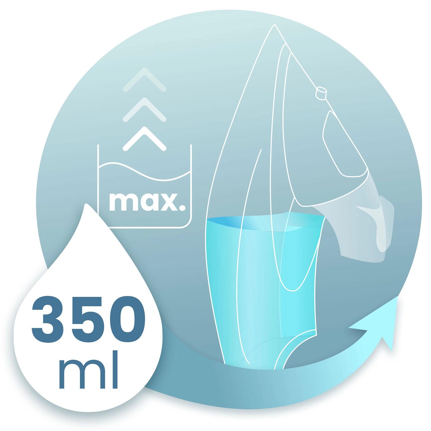 Praktične funkcije, kao što su automatsko isključivanje, Self Clean (samočišćenje), raspršivač za tvrdokorne nabore i okretni kabel 360°, povećavaju udobnost i dugovječnost uređaja. Velik spremnik od 350 ml smanjuje potrebu za čestim dolijevanjem vode, a prozirna stijenka omogućuje jednostavnu kontrolu razine.