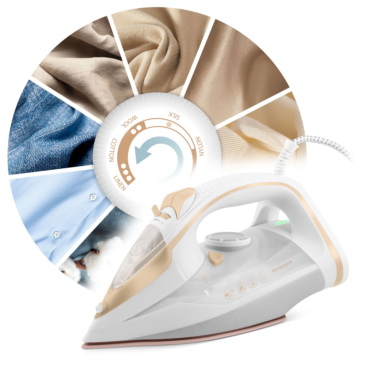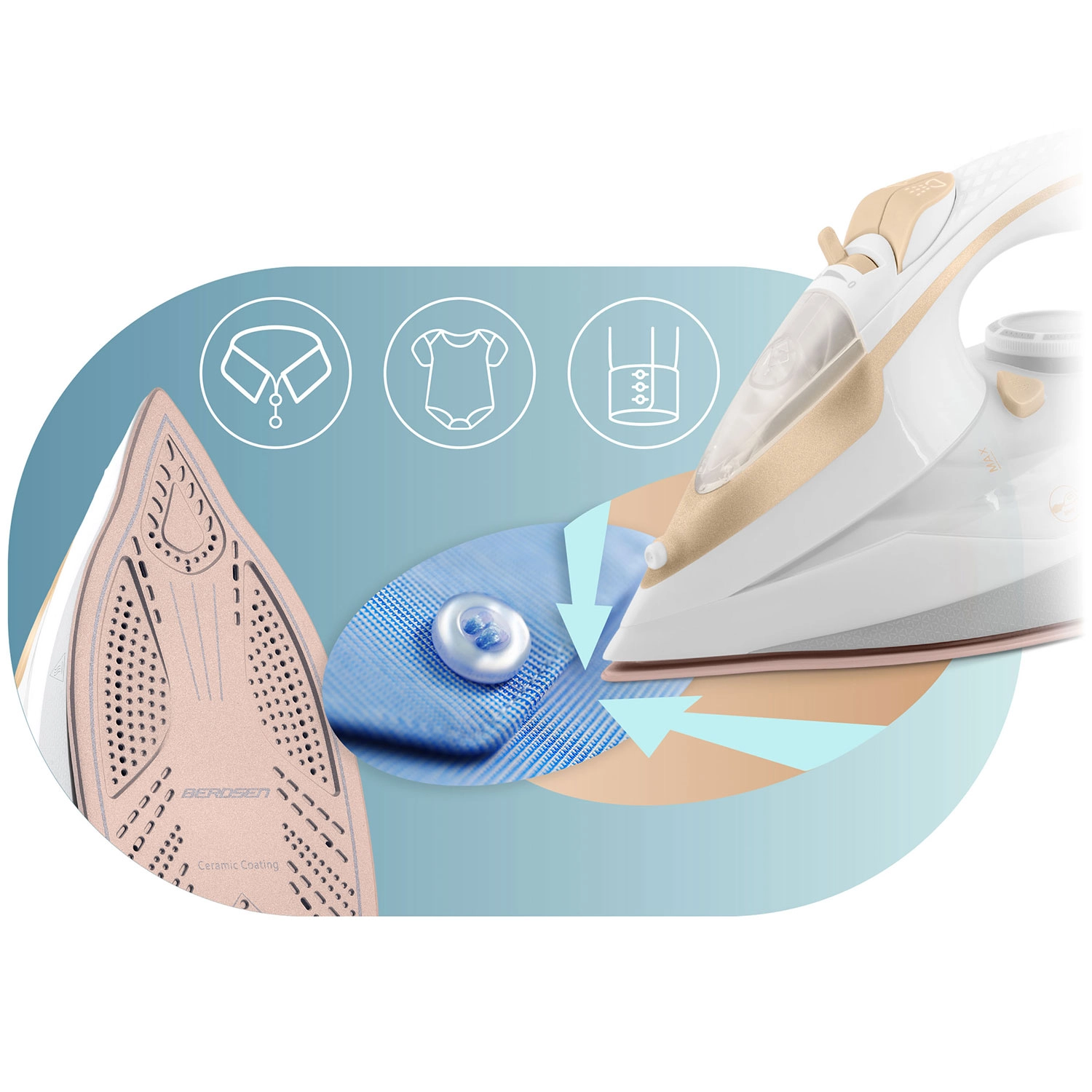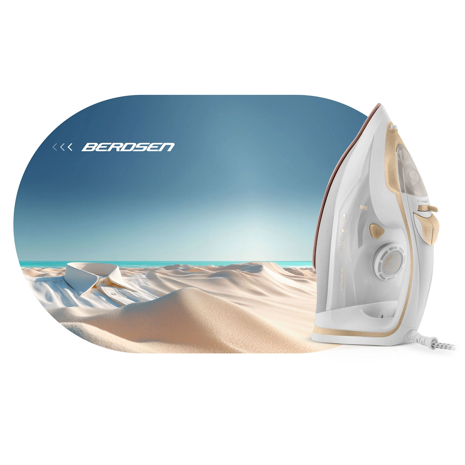 Snažno parno glačalo Berdsen s priključnom snagom 3000 W osigurava brzo i precizno glačanje svih vrsta tkanina. Nudi keramičku podlogu s mikroutočićima za ravnomjernu distribuciju pare, vertikalno parenje, glatku regulaciju temperature i pare, automatsko isključivanje te praktičnu funkciju Self Clean za lako održavanje. Veliki spremnik za vodu od 350 ml i okretni kabel 360° povećavaju udobnost korištenja.