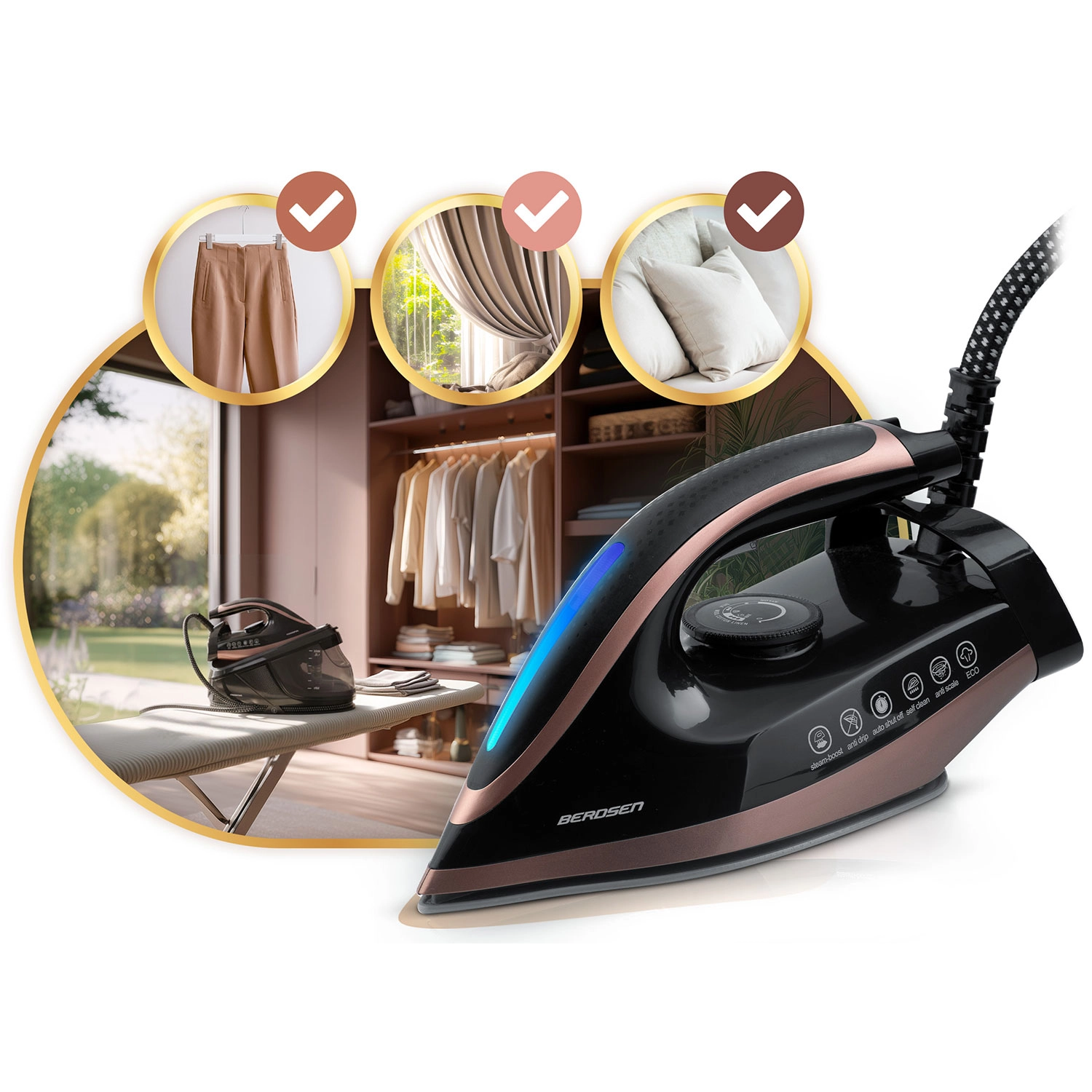 Parni generator BERDSEN idealan je izbor za kućanstva koja žele spojiti visoke performanse, udobnost i nježnost prema tkaninama. Keramička glačalna ploča s izvrsnim klizanjem i mikrokanalićima ravnomjerno raspoređuje paru, pa ćete ukloniti i tvrdokorne nabore na košuljama, linu, posteljini ili zavjesama. Zahvaljujući velikom spremniku 1,5 l možete dugo glačati bez čestog dolijevanja vode.