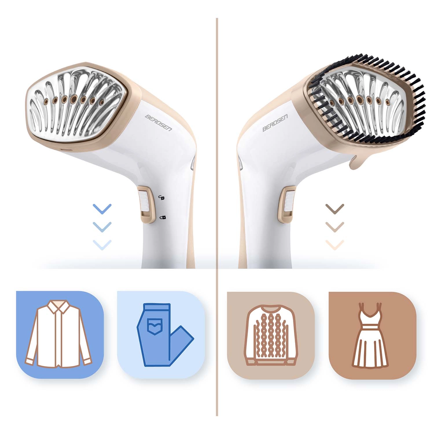 Zaboravite na dugotrajno postavljanje daske i čekanje da se glačalo zagrije. Ručni steamer BERDSEN izglađuje nabore izravno na vješalici, osvježava sakoe, košulje i haljine, a zahvaljujući jakom mlazu pare od 26 g/min lako se nosi i s tvrdokornijim naborima. Odvojivi spremnik od 230 ml omogućuje dulje parenje i praktično dopunjavanje vode.