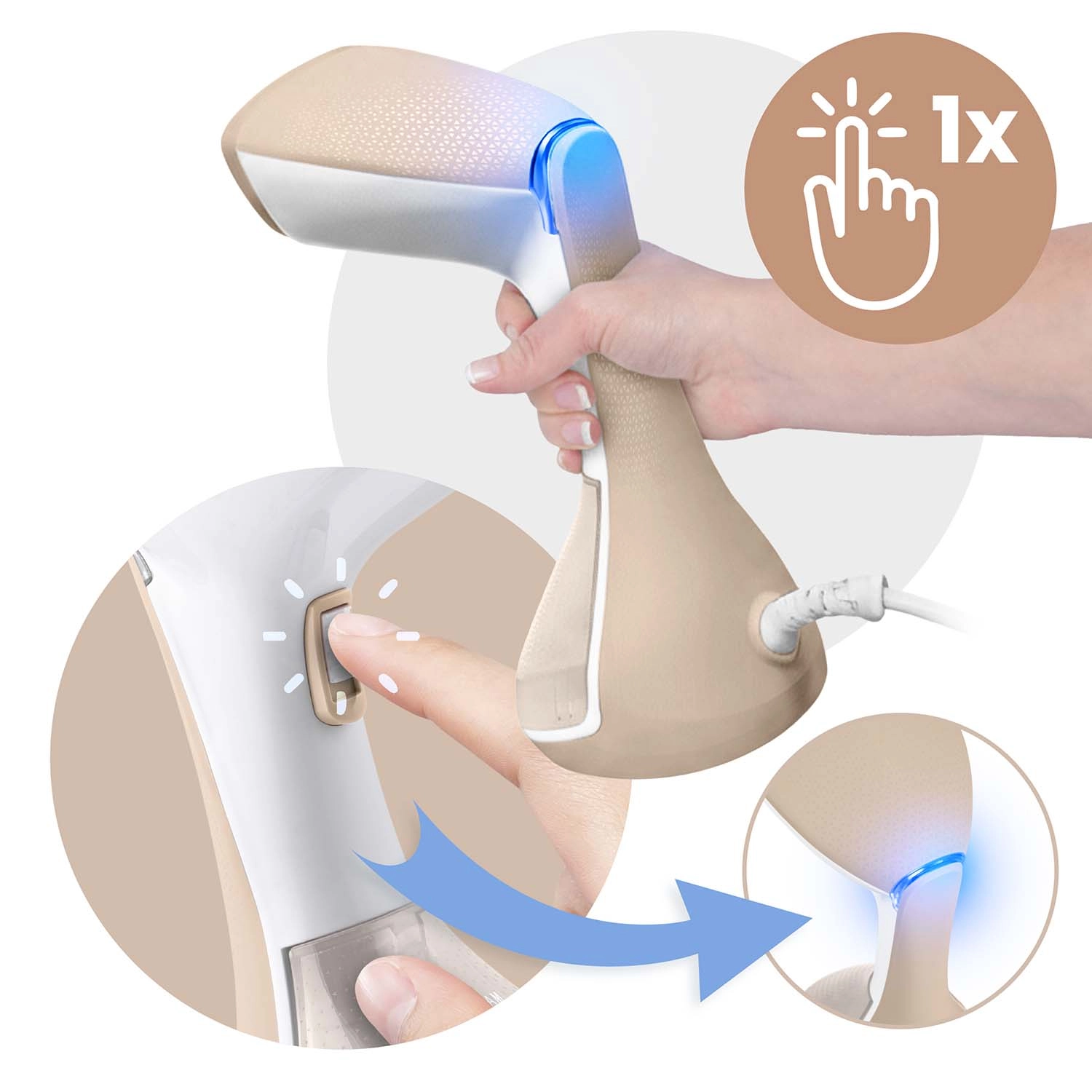 Jak mlaz pare brzo izglađuje čak i tvrdokorne nabore na košuljama, hlačama i haljinama – izravno na vješalici, bez daske za peglanje.