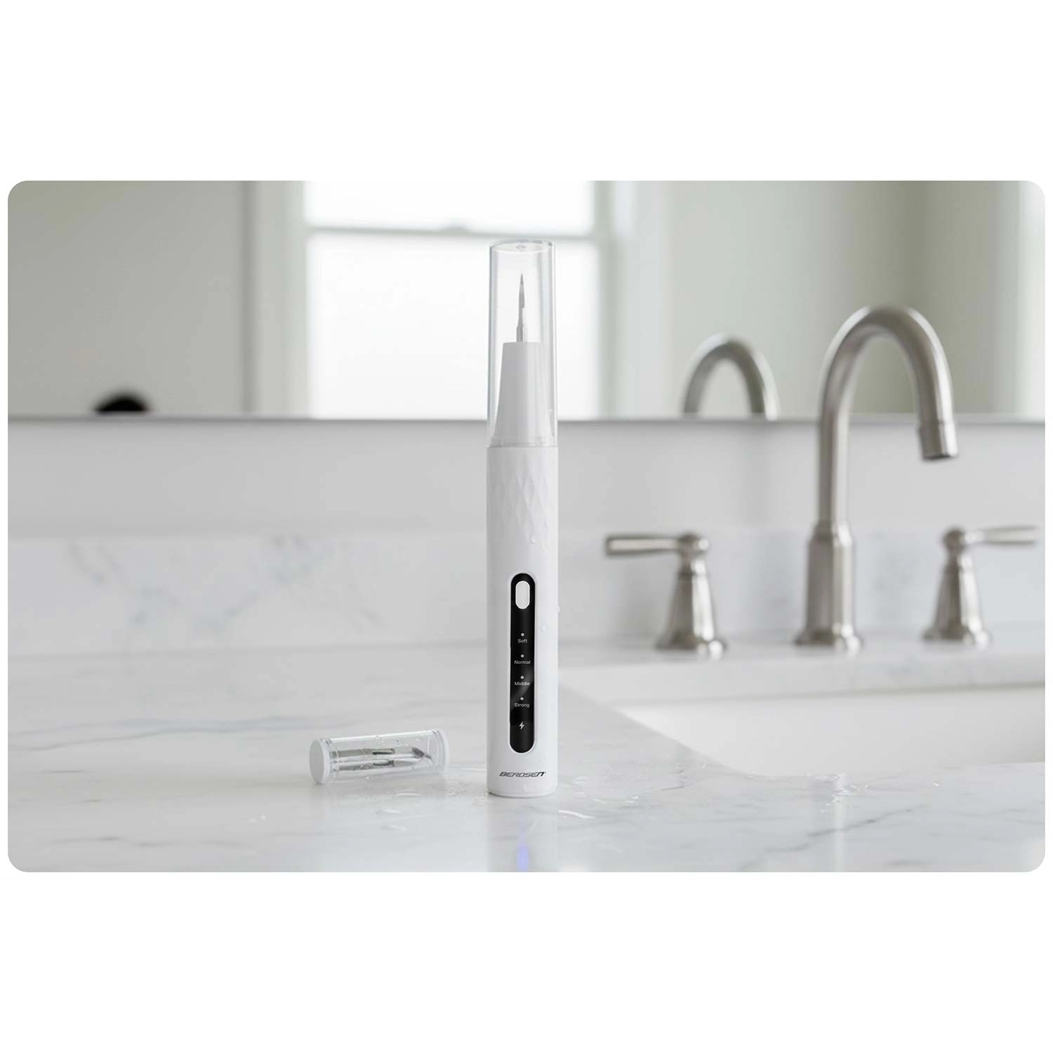 Sigurnost na prvom mjestu: Uređaj se automatski zaustavlja pri kontaktu s desnima ili jezikom. Tehnologija soničnog i ultrazvučnog čišćenja nježna je prema caklini i desnima, ali učinkovita protiv kamenca i naslaga. Zahvaljujući IPX7 skaler je otporan na vodu i prskanje, LED svjetlo povećava preciznost rada, a punjenje putem USB‑C olakšava svakodnevnu upotrebu.