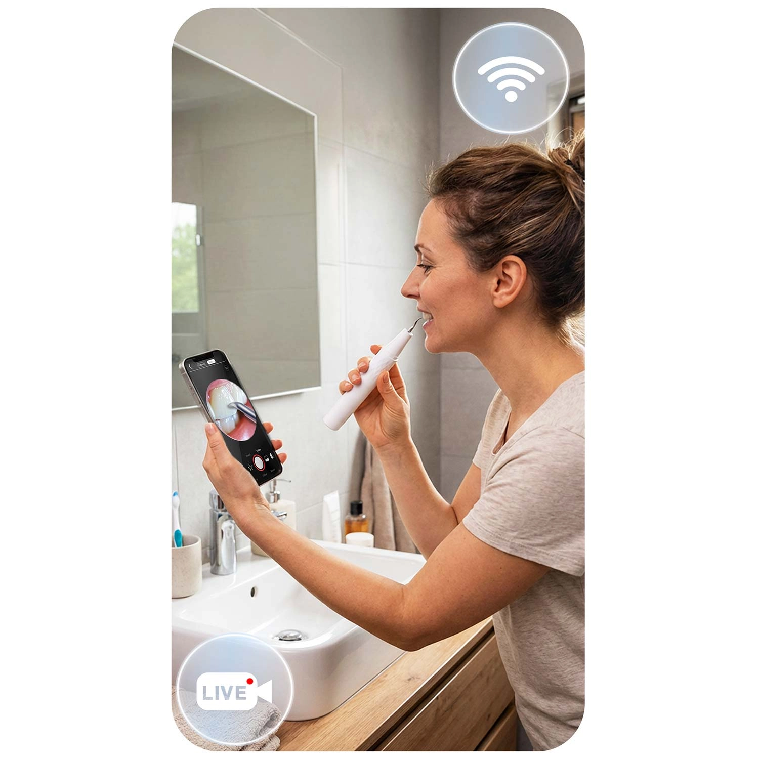 Vidite što čistite – potpuna kontrola i preciznost. Integrirana kamera 2 Mpx s LED diodama prenosi sliku u stvarnom vremenu u mobilnu aplikaciju. Tako lako prepoznajete kamenac, pigmentacije i teško dostupna mjesta te uklanjate samo ono što je potrebno – bez nepotrebne iritacije i nagađanja.