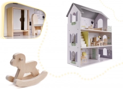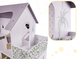 Otkrivanje čarolije drvene kućice za lutke, koja će postati središte pažnje svake dječje igre. Kućica ima tri kata i opremljena je stilskim drvenim namještajem, koji daje svakom prostoru jedinstveni izgled. Odaberite između vrta, kuhinje, spavaće sobe i dnevnog boravka, koji su savršeno dizajnirani za igru s lutkama.