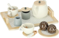 Sve na jednom poslužavniku: čajnik, šalice, tanjurići, vrč za mlijeko, posudica za šećer, žličice i slatka točka na i. Djeca mogu realistično posluživati i vježbati socijalne vještine.