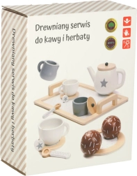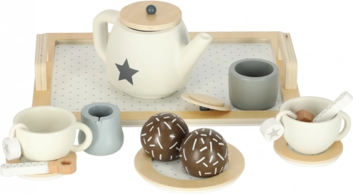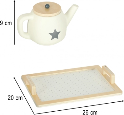 Elegantni drveni čajni set u neutralnim bojama sa zvjezdanim detaljima idealan je za dječje čajne zabave. Djeca mogu posluživati čaj, mlijeko i “desert”, vježbati pristojnost i komunikaciju te istodobno razvijati maštu.
